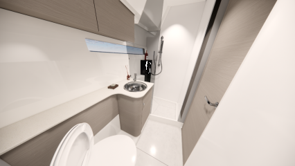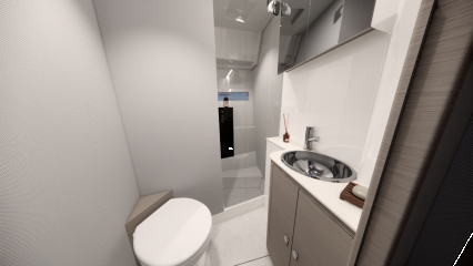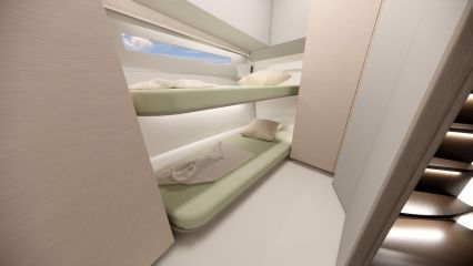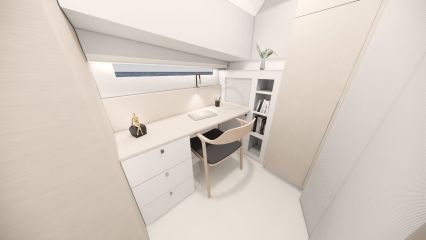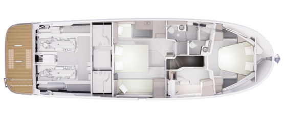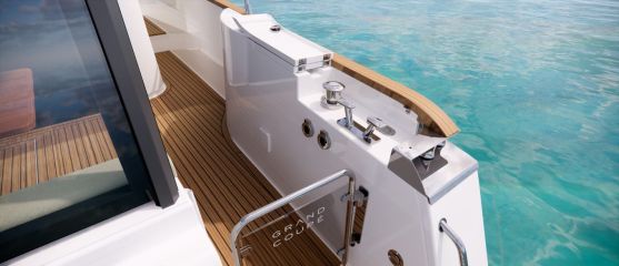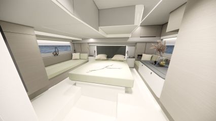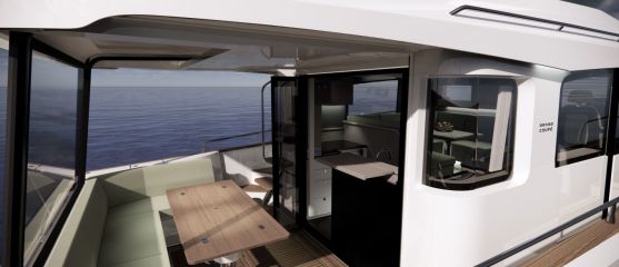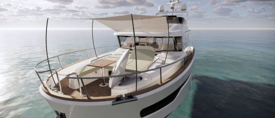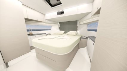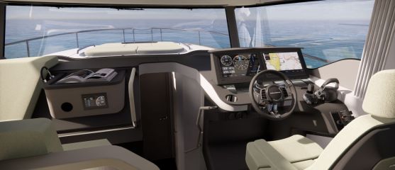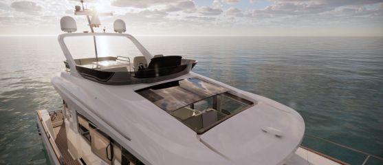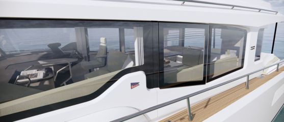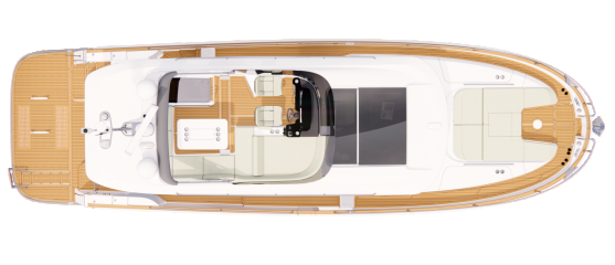 Silti tilaa vaikuttaisi pohjapiirroksien ja renderikuvien perusteella olevan. Kokoluokka huomioiden ehkä kompaktein tila on yläkansi, jota ei ole venytetty äärimmilleen. Toisaalta flybridgen etupuolella on kookas lasikattoluukku ja takana tilaa aurinkopaneelille. Silti mukaan on mahtunut ohjaamon erillisistuimet, pöydällinen kulmasohva ja loikoilutaso. Vain pentterikaappi puuttuu.