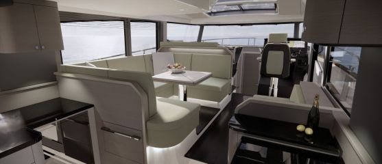 Varsinaiset sisäoleskelutilat on sijoitettu sisäohjaamon ympärille. Paapuurin puolella on etummaisena mukavalta näyttävä loikoilutaso ja sen takana ruokapöydällä varustettu U-sohva. Lisäksi styyrpuurin laidalle jää sivuoven taakse sohva, jonka istuinosat voi siirtää jakkaroiksi pöydän ääreen.