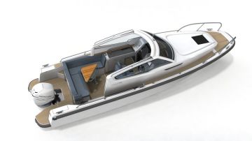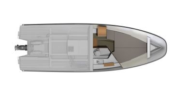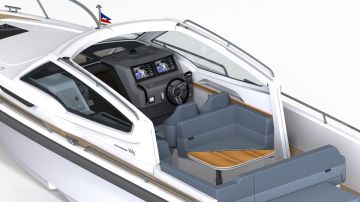 Tilaratkaisu on molemmissa moottorityyleissä lähes identtinen. Sisäperämoottorissa on vain isompi uimataso ja peräsohvan jatkeen pieni pätkä aurinkotasoa. Muilta osin avotila koostuu kulmasohvasta, varsin tilavalta näyttävältä pentteriltä sekä ohjaamon erillisistuimista, joiden jatkeen on pienempi kulmapenkki. Kojelaudassa on tilaa kahdelle suurelle monitoiminäytölle. Laitetoimittajana näyttäisi kuvien perusteella jatkavan Simrad.