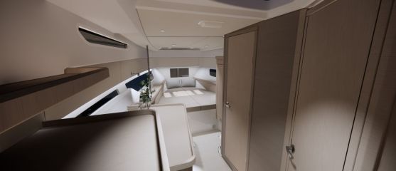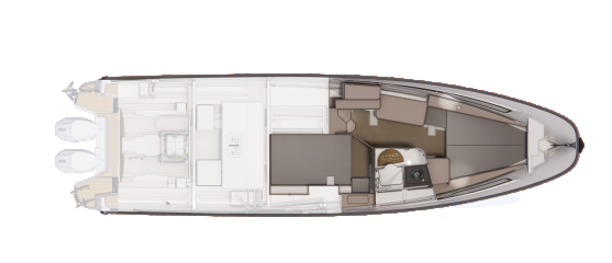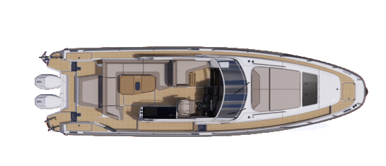 Pentteri sekä matkustus- ja oleskelutilat ovat ulkosalla, mutta kuomun tai kookkaan hardtopin sekä tuuli- ja sivulasien suojaamia. Valtaosan avotilasta haukkaa todella kookkaalta vaikuttava sohva ja sen jatkeena oleva perän aurinkotaso. Paapuurin laidalla on lisäksi pienempi lounge sohvan etupuolella. Keulakannelle saa nykymuodinmukaisen aurinkopatjan, jossa on ylös nostettava selkänoja.