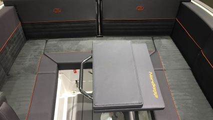 Daycruiserien tapaan tilaratkaisun pääpaino on avotilassa, jota hallitsee suuri u-sohva. Pöytä ja mahdollisuus laajentaa sohva aurinkotasoksi tai varavuoteeksi ovat vakiovarusteita.