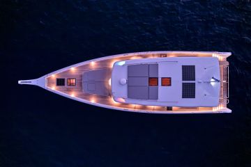 Takakannelle kuljetaan ohjaushytin lasiovesta. Ulkotilassa on kaksi runsaasti mitoitettua vastakkaista sohvaa ja pöytä, sekä niin runsaasti tiikillä tai jollakin synteettisellä materiaalilla verhoiltua turkkipinta-alaa, että isompikin joukko mahtuu mukaan tansseihin. Uimatasolla, jolle laskeutuu kahdet symmetriset portaat, on lisää tilaa ulko-oleiluun. Rusketuksen perään haikailevat löytänevät oman alueensa ohjaushytin katon aurinkopatjoilta, joille pääsee etukannen tikkaita pitkin.