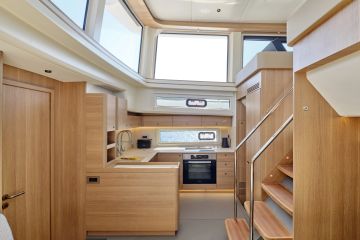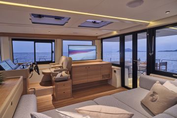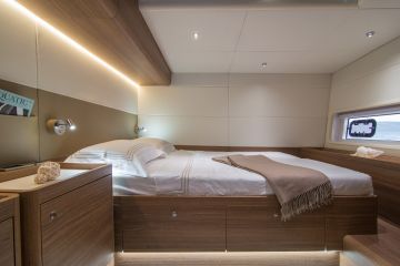 Majoitustilat löytyvät keulasta ja ohjaushytin alapuolelta. Keulan “omistajanhytti” on avara ja valoisa. Sen molemmilta sivuilta avoin tuplasänky takaa makoisat yöunet. Enemmän makuupaikkoja kaipaava voi tilata keulan tilan kahtena erillisenä kahden hengen hyttinä. Vierashytit sijaitsevat ohjaushytin alla, molemmin puolin keskiportaita. Sisätilojen materiaaleissa on käytetty valkoisia seinä- ja kattopintoja, vaaleaa puuta sekä harmaata tekstiiliä, luoden tyylikkään ilmeen.