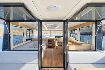 Ohjaushytti on korkea, mutta veneen kokoon nähden melko kapea. Tällä ratkaisulla veistämö on halunnut taata leveämmät sivukannet mukavaan ja turvalliseen liikuskeluun. Hytin ikkunat ovat isot, joten näkyvyys ulos on oletattevasti mainiolla tasolla. Ohjaushytissä paapuurin puolella on leveähkö sohva rentoon oleiluun. Sohvan vastapäätä, styyrpuurin laidalla, on kolme säilytyskaappia, joihin on upotettu tv. Kaappien edessä on ohjaamo, jonka sohvalle mahtuu kipparin lisäksi vänkäri. Ohjaamon sivussa olevasta liukuovesta pääsee tarvittaessa pikavauhtia sivukannelle.
