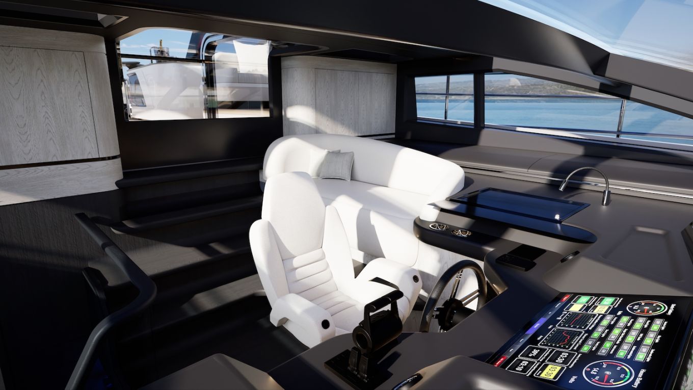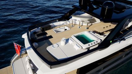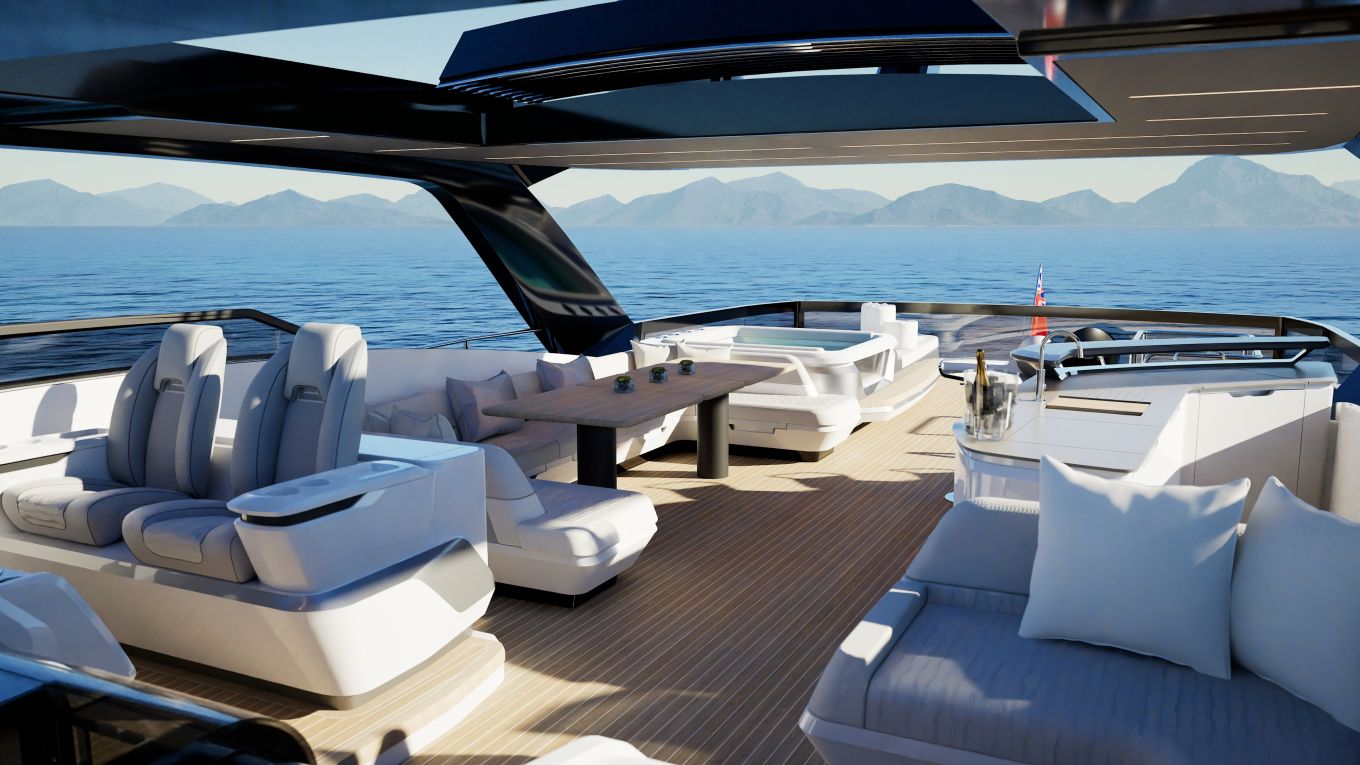 Puolitoista ylintä kerrosta muodostuvat mastersviitin katolla olevasta keulakannen muhkeasti kalustetusta ulko-oleskelutilasta, sisäohjaamosta ja sen takana olevasta ulko-ohjaamon, baarikeittiön, massiivisen U-sohvan, porealtaan ja sekä aurinkotason että jumppatilan käsittävästä flybridgestä, jonka paapuurin laidalta on kulku keulakennelle.