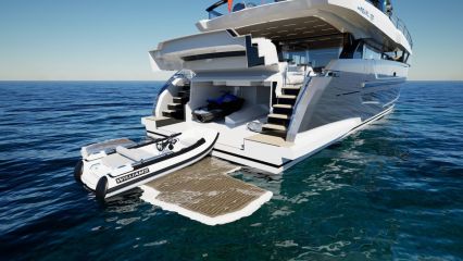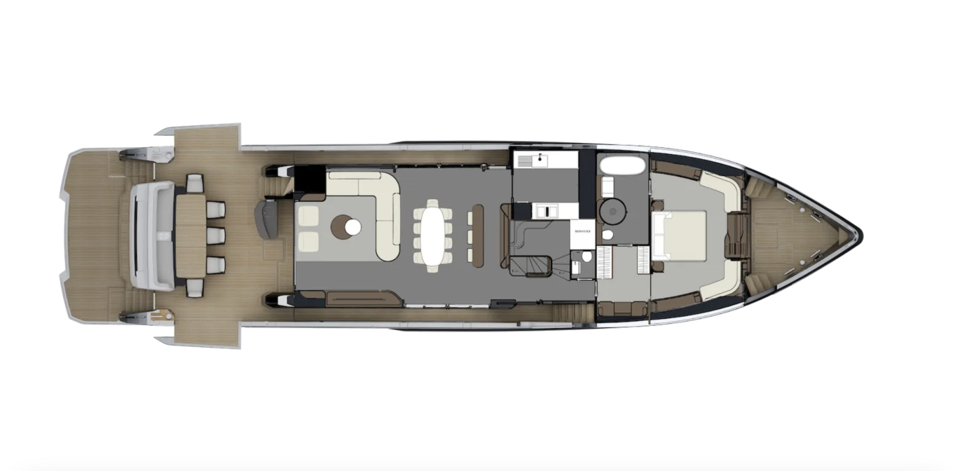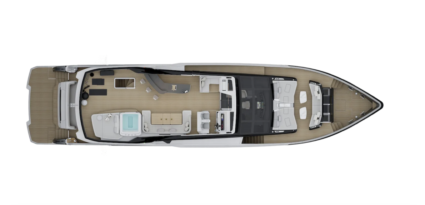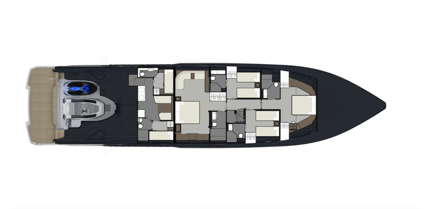 Uusi lippulaiva 100 Hybrid on 3,5-kerroksinen, niin kutsuttu raised pilothouse -tyyppinen moottorijahti. Alimmalla eli majoituskannella on kaksi suurempaa ja kaksi pienempää vieraskajuuttaa sekä tilat miehistölle. Ne kaikki sijaitsevat konehuoneen etupuolella, joten perään on jäänyt tilaa suurelle tallille, johon mahtuu sekä ribbi (Williams 445) että jetti (Sea-Doo Spark). Uimataso on luonnollisesti hydraulinen, eli veden pinnan alle laskettavissa.