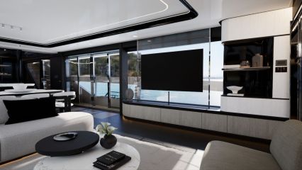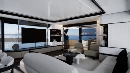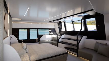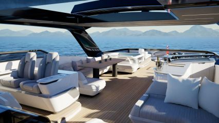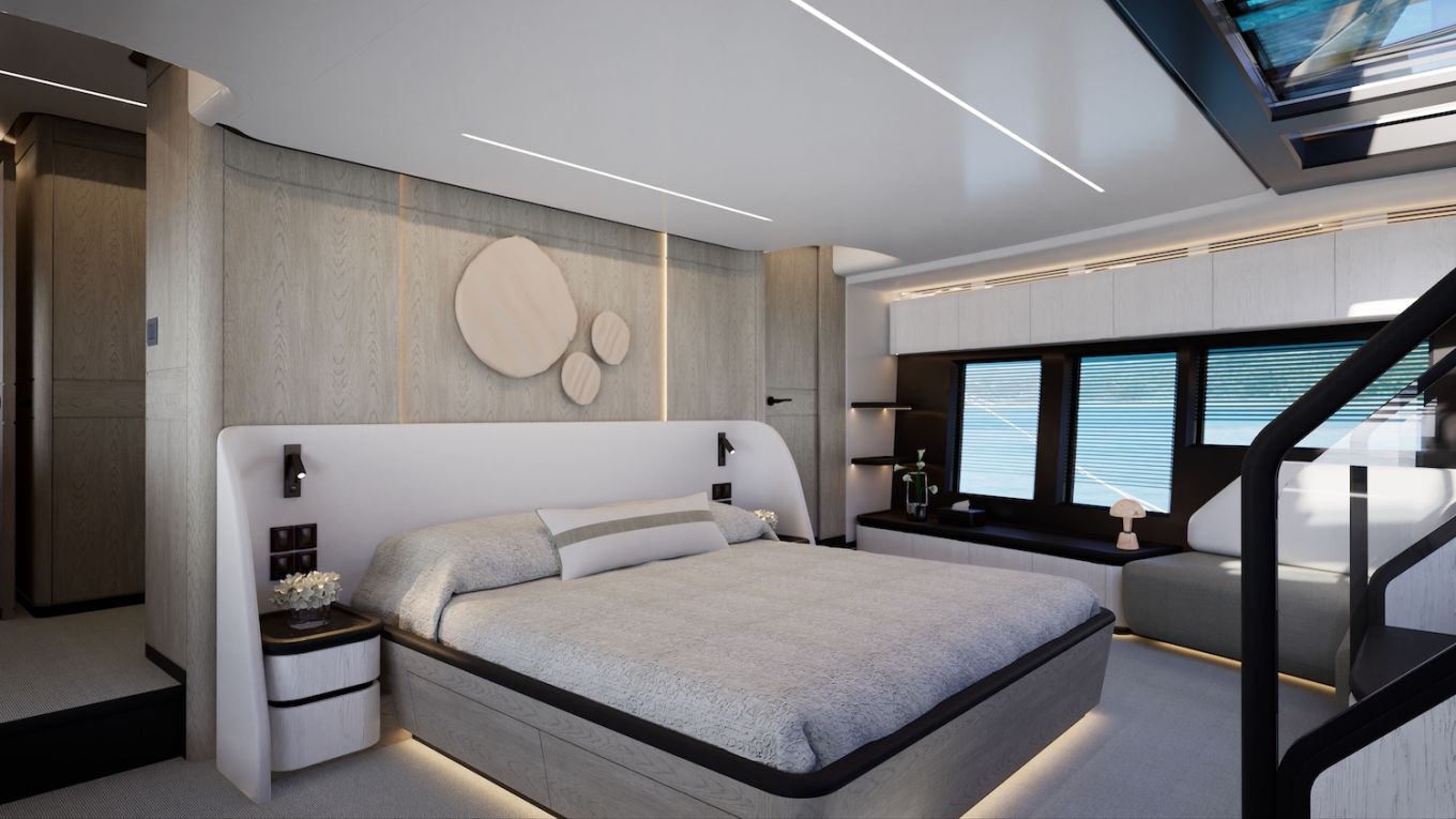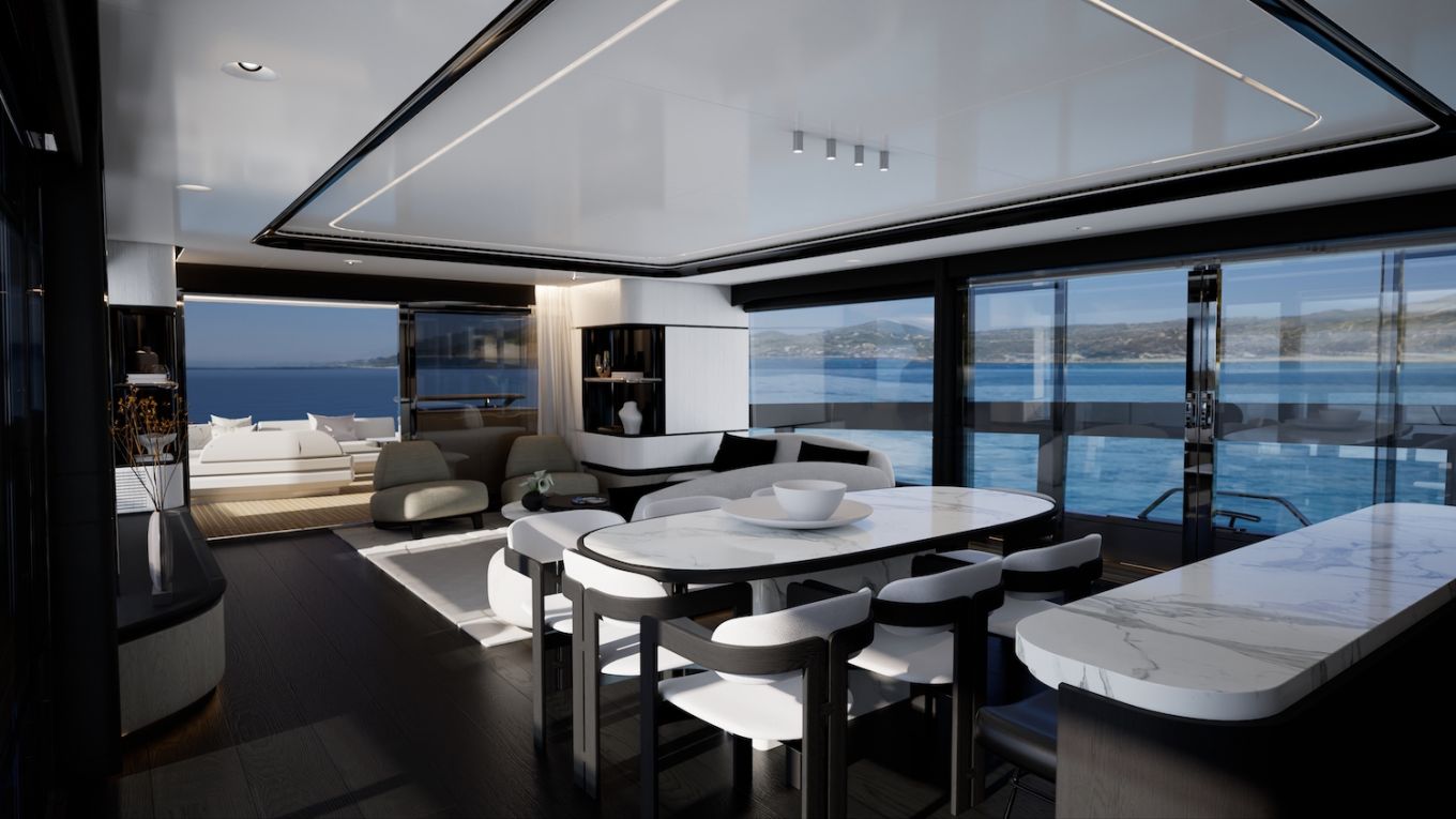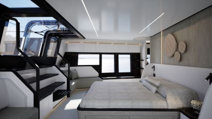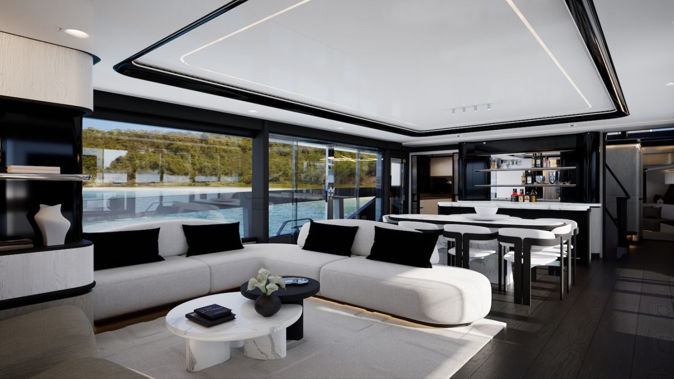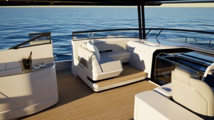 Korotettu sisäohjaamo vapauttaa koko pääkannen pituuden muuhun käyttöön. Pearl ottaa asiasta kaiken ilon irti sijoittamalla valtavilla sivuikkunoilla ja yksityisellä keulaterassille kululla varustetun omistajansviitin majoituskannen sijaan pääkannelle. Tilaa jää silti ammattitason keittiölle, ruokailutilalle, sisäsalongille sekä takakannen ulko-oleskelutilalle, jonka kalustuksen voi valita kahdesta optiosta ja lattiapinta-alaa kasvattaa avattavilla laitaterasseilla.