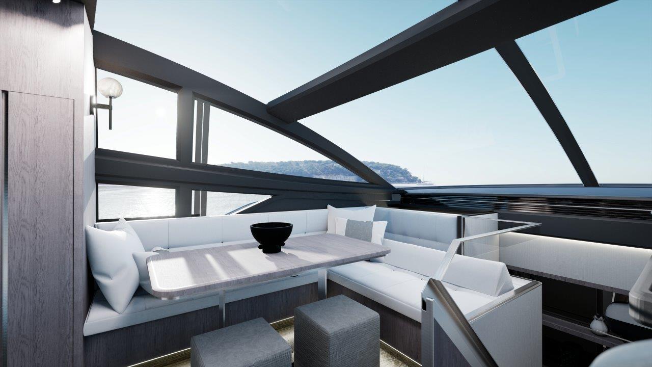 Uuden 72:sen taustalla ovat veistämön aiemmista luomuksista tutut Bill Dixon ja Kelly Hoppen. Dixon on piirtänyt alukselle sen ulkoisen olemuksen ja Hoppen vastaa sisustuksesta. Etäisesti koripallokengän näköistä silitysrautaa muistuttavan 22-metrisen jahdin kauneus on katsojan silmässä. Todettakoon kuitenkin, että lainatessaan linjoja vuonna 2020 ensiesittellyltä pikkusiskoltaan 62:lta, Dixon on tavoitellut samaa urheilullista lookia. Myös 62:nen on Dixonin ja Hoppenin yhteistyön hedelmä.