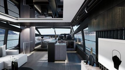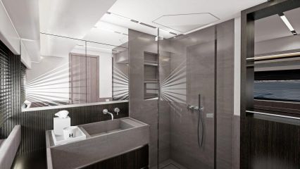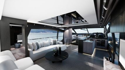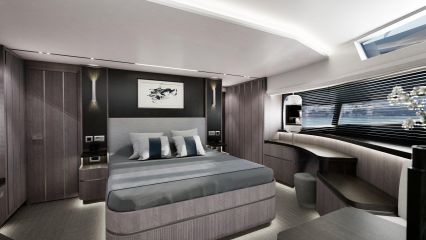 Huomionarvoista 72:sen suunnittelussa on, että jahdissa on kaksi niin sanottua omistajan sviittiä. Keulan isoon sviittiin on oikeiden megajahtien tyyliin oma sisäänkäyntinsä. Toinen sviitti sijaitsee keskilaivassa. Mikään pieni komero ei tämäkään ole, onhan se koko rungon levyinen. Vieraille on neljä kahden hengen hyttiä ja aluksen miehistölle luonnollisesti omat kortteerinsa. Myös vesilelut kulkevat mukana. Rungon kyljen talliin sopii kymmenenmetrinen tenderi ja vesijetti.