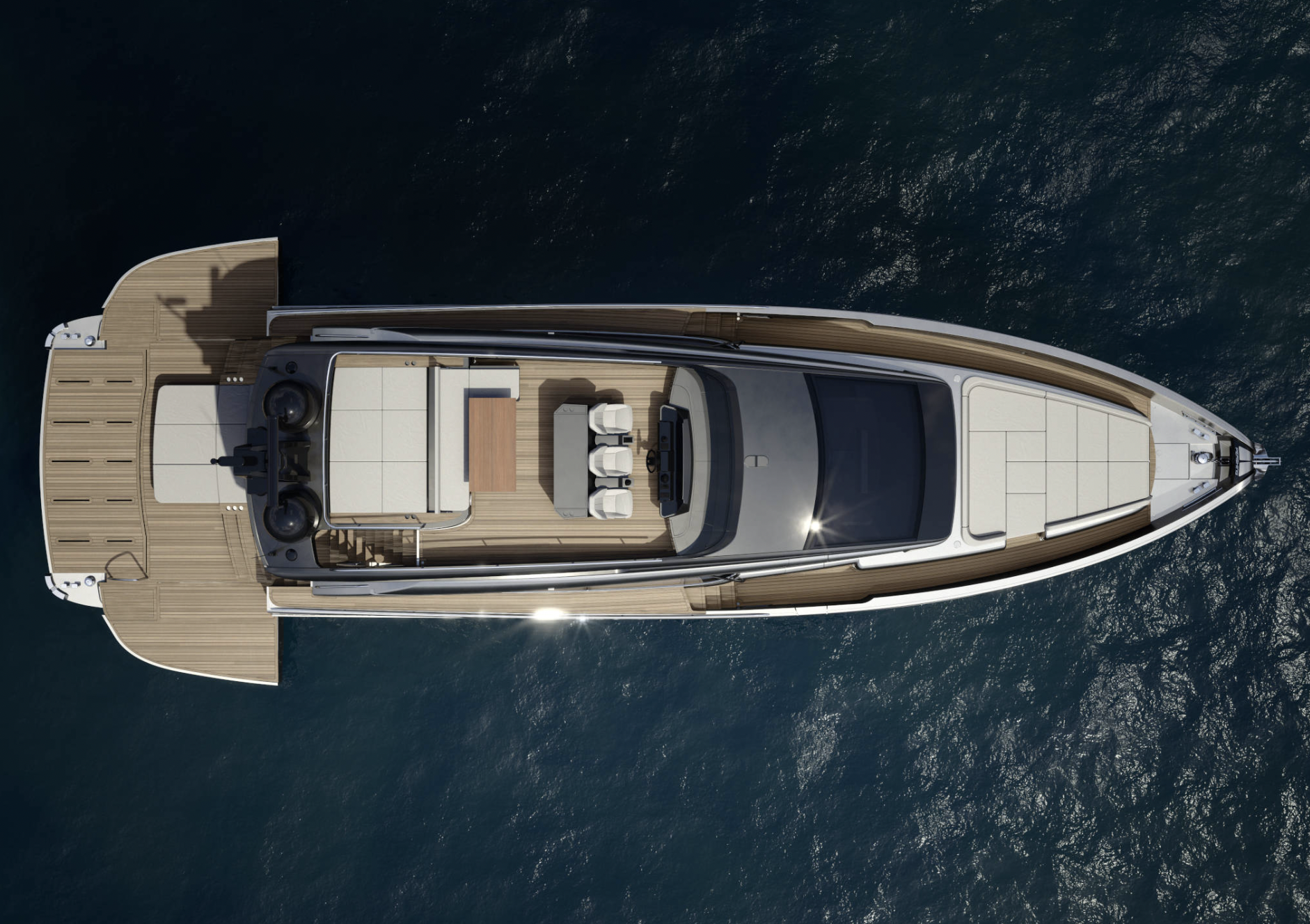 Perässä sijaitseva beach area on varustettu tässä ensimmäisessä yksilössä aurinkopatjalla, joka on integroitu perän rakenteeseen. Kun sivuterassit avataan, käytettävissä oleva oleskelutila kasvaa yhteensä hulppeaan 23 neliömetriin. Huomiota herättää myös uimataso, joka voidaan nostaa samalle tasolle beach arean kanssa, mikä kasvattaa käytettävää tilaa entisestään. Taso toimii myös vesijetin tai Williams 325 -jettitenderin laskualustana.