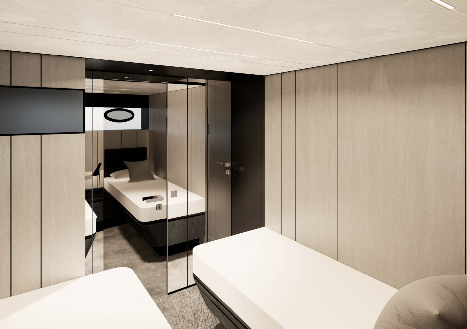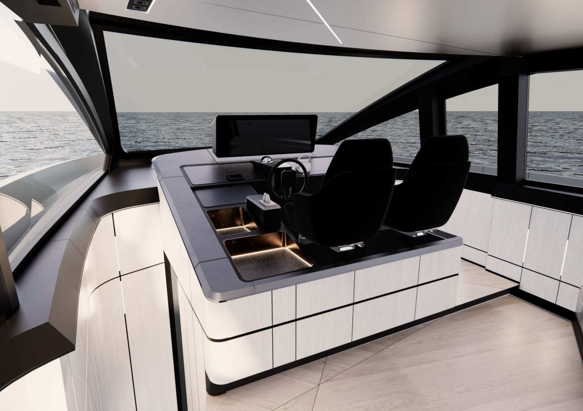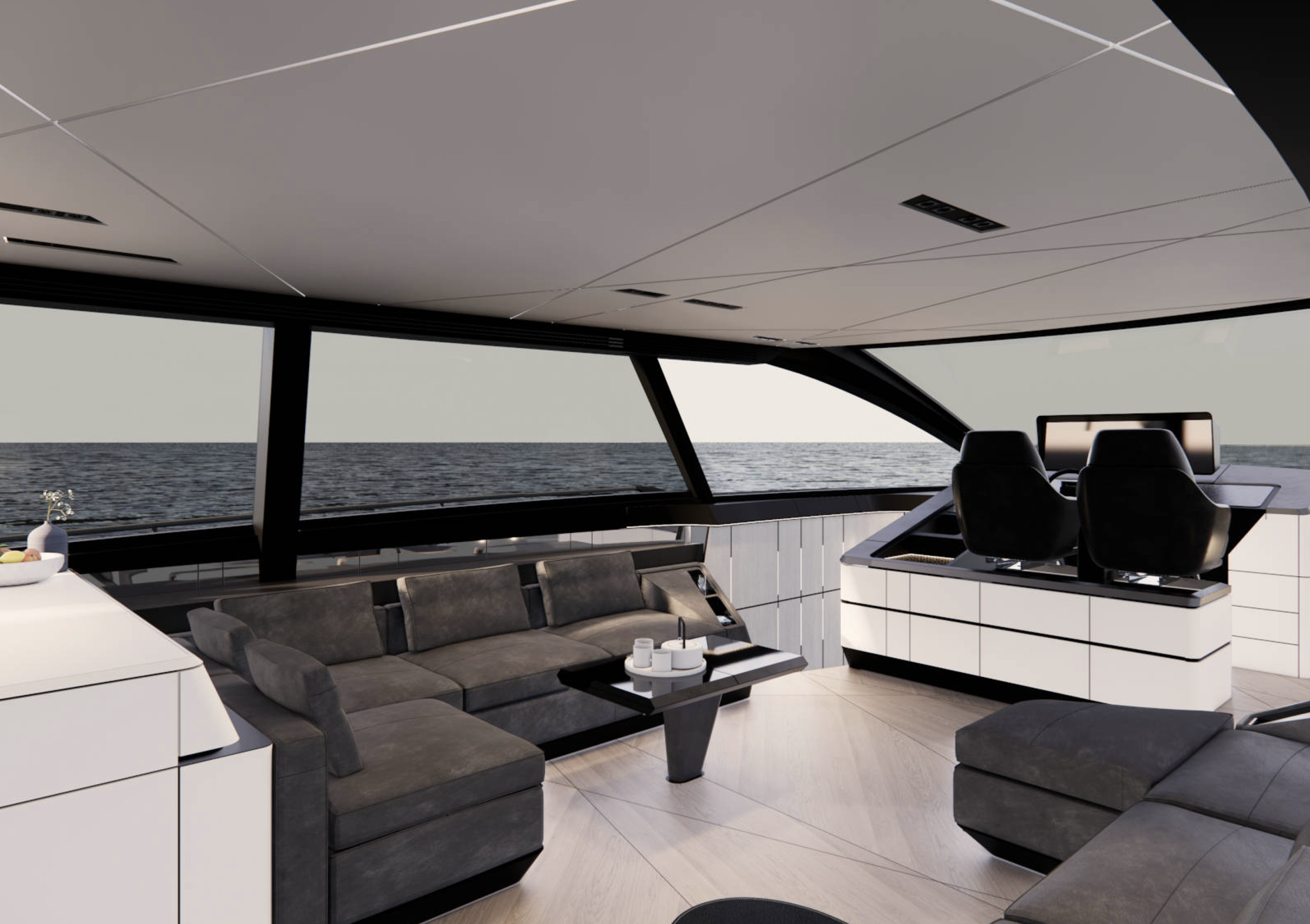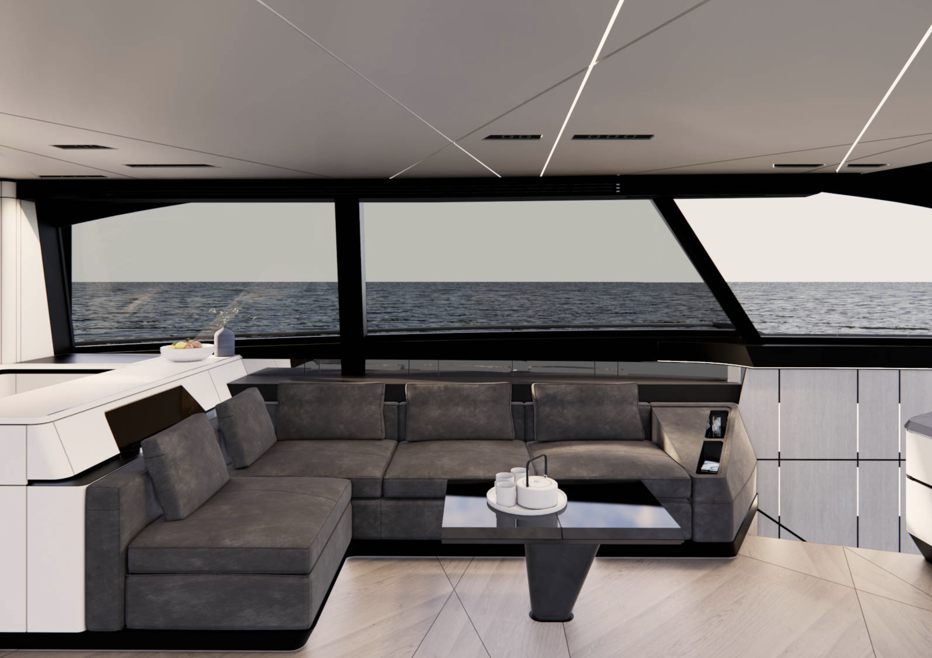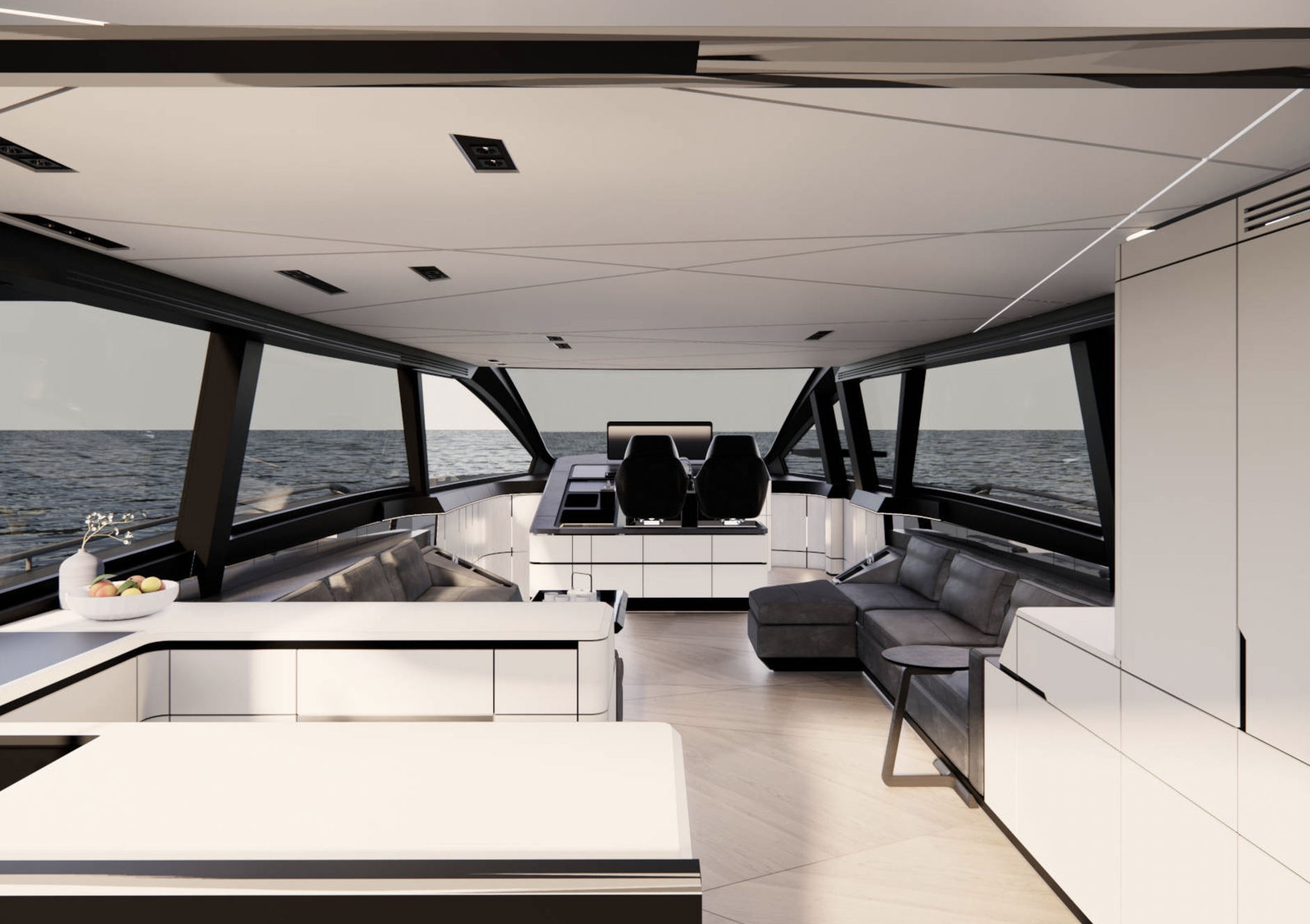 Salongissa vastakkain sijoitetut L-muotoiset sohvat luovat tilaan lisää tasapainoa. GTX 70:n sisätilojen värimaailma on valittu korostamaan eri elementtien kontrasteja. Esimerkiksi tummaan nupukkinahkaan verhoillut sohvat resonoivat näyttävästi hillitymmin sävytetyn portaikon kanssa. Kattoa koristavat ledivalonauhat, jotka levittävät pehmeää, hajavaloa koko kannelle – sama valaistustyyli toistuu myös alemmalla kannella, jolta löytyy kolme omilla kylpyhoneilla varustettua hyttiä.