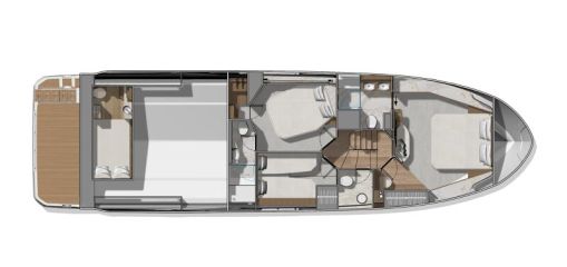 Vieraskajuutat on sijoitettu keskiveneeseen, suurempi parivuoteellinen ja yksityistoiletilla varustettu paapuuriin, ja kompaktimpi kahden erillispunkan kolmoskajuutta styyrpuurin puolelle päivätoiletin viereen.