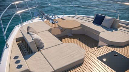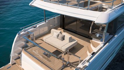 Perä- ja yläkannen kalustukseen on valinnanvaraa. Vakiona on rennot loikoilusaarekkeet, joilta voi seurata auringon painumista horisonttiin tai vesipetojen temmellystä. Läpinäkyvät peräseinämät eivät pilaa näkymiä. Vaihtoehtona on formaalimpi ruokailuryhmä peräkannella tai erilliset aurinkotuolit yläkannelle.
