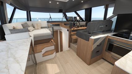 Keulakannelle pääsee tosin sujahtamaan tarvittaessa sisäohjaamon liukuovesta. Liukuovia on enemmänkin, sillä kansisalongin takaseinän lisäksi myös paapuurin sivu aukeaa isosti. Salongin sohvaryhmä jää avattavien seinien vuoksi ehkä vähän tavanomaista pienemmäksi, ainakin illallistamista ajatellen. Petterissä näkyy ainakin sähköisesti pöytätasosta ylös nousevia säilytystilaratkaisuja.