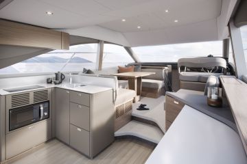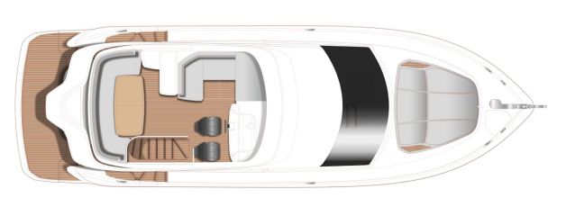 Flybridgellä ohjaamon erillisistuimet on viety styyrpuurin laidalle, toisella puolella on aurinkotasoksi muuntuva kulmasohva ja pentterimoduuli. Yläkannen takaosan valtaa kookkaalta vaikuttava u-sohva.