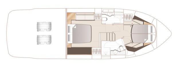 Tilaratkaisussa on otettu askelia nykymuodin suuntaan. Sisätilojen osalta se tarkoittaa mastercabinin eli omistajankajuutan siirtymistä keulasta keskiveneeseen ja pentterin paikan vaihtumista kansisalongin perälle. Molemmat ovat haluttuja ja tuttuja ratkaisuja jo monesta muusta vastaavan kokoisesta yläohjaamoveneestä.