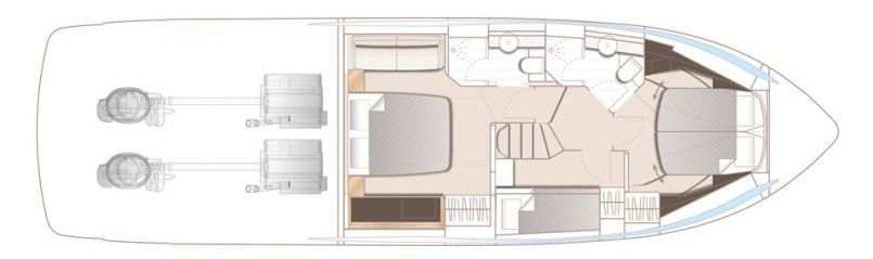 Majoituskannella riittää silti tilaa kolmelle makuukajuutalle ja kahdelle suihkukomerolla varustetulle toiletille. Isolla toiletilla varustettu mastersviitti on jo tuttuun tapaan keskiveneessä. Keulakajuutassa on saksivuode ja oma sisäänkäynti paapuurin laidalla sijaitsevaan toilettiin. Styyrpuurin kolmoskajuutassa on tyytyminen kerrosvuoteisiin.