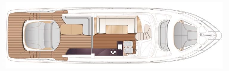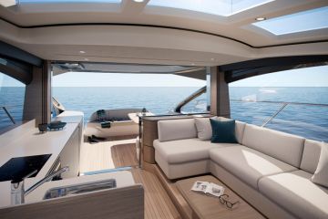 Avotila on sportcruiser-tyyliin laaja. Suuren aurinkotason etureunassa on sohva ja sen etupuolella sivulasien suojassa L-sohva ja sähkögrillillä varustettu ulkopentteri. Takaseinä on avattavissa alas hissaantuvaa ovea myöten koko laajuudeltaan, joten kansisalonki ja sisäpentteri ovat niin halutessa saumattomasti avotilan kanssa samaa tilakokonaisuutta. Ohjaamon sivuikkuna ja kookas kattoluukku liikkuvat sähköllä, samoin viihdekeskuksen 49-tuumainen töllö.