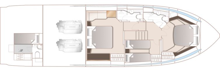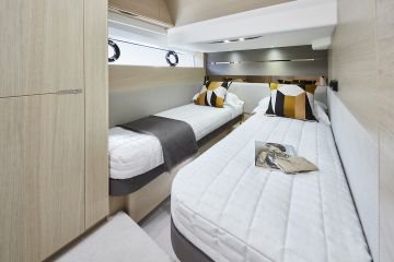 Takakannen ulkotilaa täydentää keulakannen laaja oleskelukokonaisuus, johon kuuluu kookas sohva ja vielä suurempi aurinkotaso. Kannen alta löytyy kolmen makuukajuutan ja kahden toiletin järjestely. Omistajan sviitti on keskiveneessä ja varustettu luonnollisesti yksityisellä toiletilla.