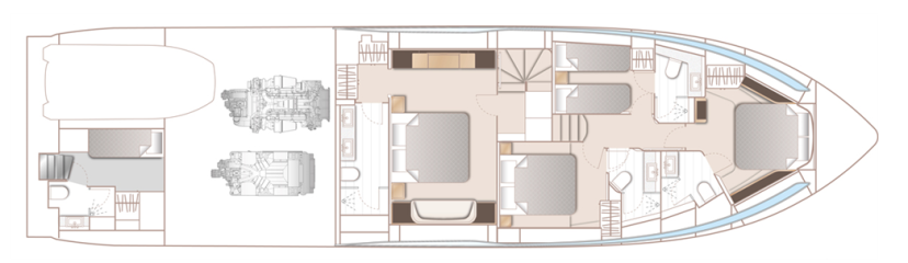 Kannen alla on neljän makuukajuutan layout. Kaikissa makuukajuutoissa on luonnollisesti omat wc- ja suihkutilat. Perästä löytyy sekä kumivenetalli että miehistöhytti.