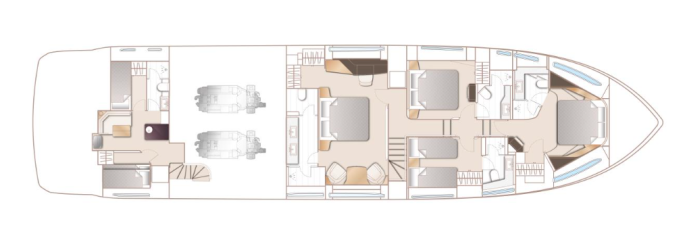 Tilat on jaettu flybridge mukaan lukien kolmeen kanteen. Majoituskannelta löytyy neljä makuukajuuttaa. Kaikki ovat sviittejä, eli varustettu omalla toiletilla. Suurin lukaali on varattu omistajan käyttöön ja sijoitettu keskiveneeseen. Ehkä pieni yllätys on, että omistajankajuuttaan kuljetaan samaa rappukäytävää kuin vieraskajuuttoihin. Perässä oleviin miehistötiloihin on sentään oma, huomaamaton kulkutie.