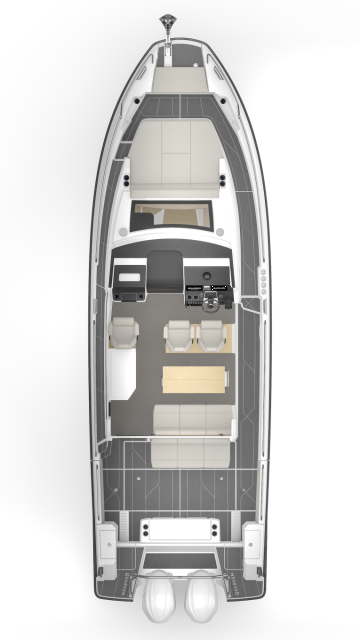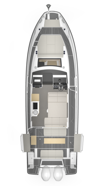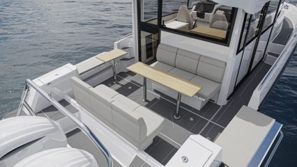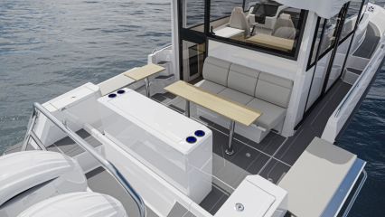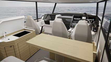 Keulakantta koristaa selkänojallinen kolmen loikoiltava divaani. Takakannella on puolestaan vastakkaiset sohvat, joiden väliin saa pöydän. Etenkin ohjaushytin takaseinustaa vasten oleva sohva tarjoaa varmasti mukavan suojaisat istumapaikat ulkona matkustamiseen. Peräsohvan tilalle saa vaihtoehtoisesti grillillä, kylmiöllä ja vesipisteellä varustetun wet barin.