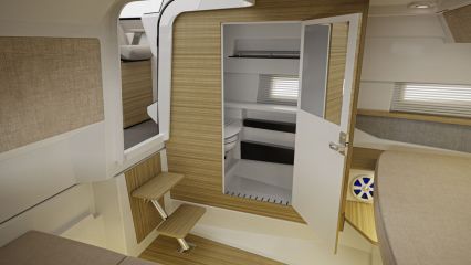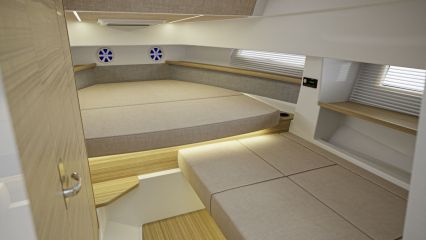Myös keulakajuuttaan on saatu mukaan hiukan tavanomaista enemmän tilaa ja toiminnallisuutta. Keulimmaisena on tuttuun tapaan parivuode. Sen jatkeena on styyrpuurin laidalla sohva, josta saa selkänojien avulla pedattua lisävuoteen. Parhaimmillaan vuodepaikkoja on sisätiloissa siis jopa kuudelle. Keulakajuutan paapuurin laita on varattu suihkulla varustetulle toiletille, jossa asiointi tapahtunee korkeuden puolesta pikemminkin istuen kuin seisten.