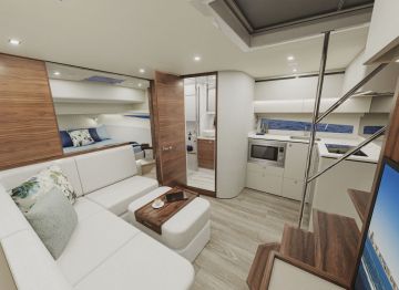 Pääkansi on suhteellisen korkealla, mistä seuraa hyvänä asiana yhdessä tasolla oleva lattia. Tutulla paikalla olevaa ohjaamoa tosin näyttäisi olevan vähän korotettu. Ohjaamoa vastapäätä paapuurin laidalla on wet bar -tyyppinen apukeittiö ja sivukannelle aukeava ovi.