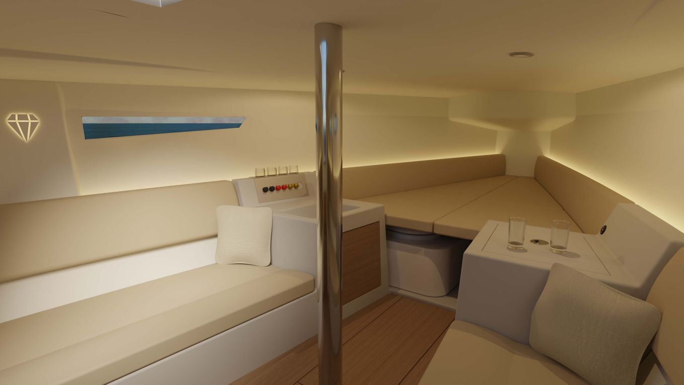Suuri avotila on mitoitettu jopa kahdeksalle hengelle. Osa sijoittuu peräkannen loikoilupatjoille, mutta paremmin suojaa antaa matalan tuulilasin taakse kahdesta pitkästä penkistä koostuva matkustamo. Täysmittainen levanki on peräkannella ohjaamon istuinten takana.