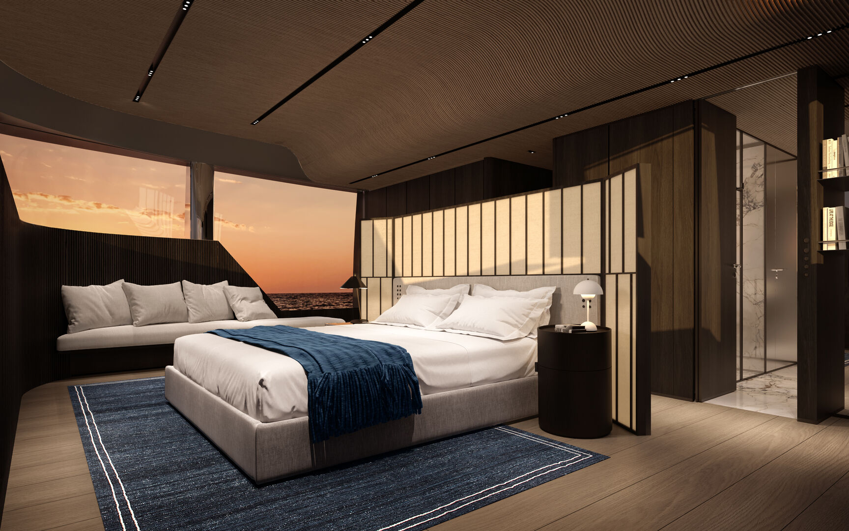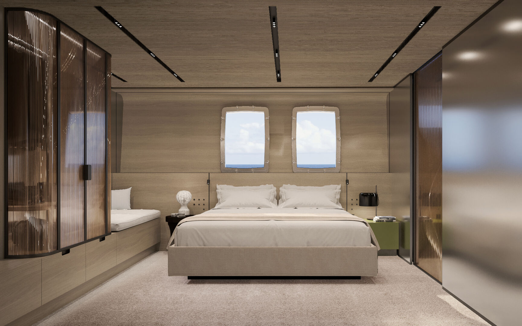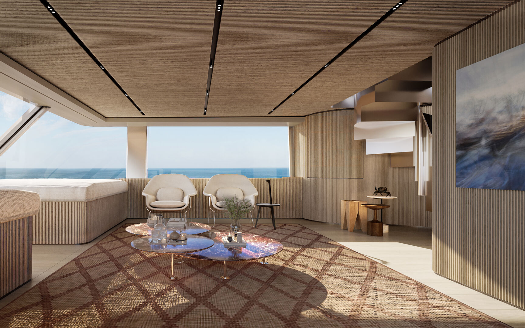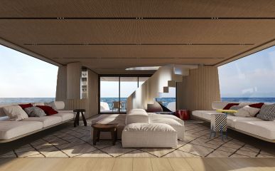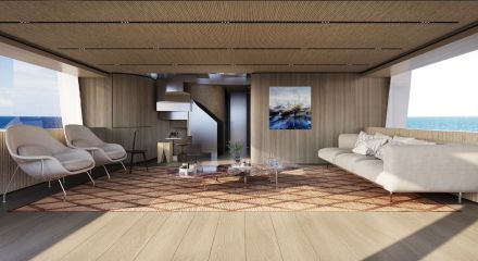 Pääkannella sijaitseva omistajan sviitistä avautuu panoraamanäkymä merelle ja tilasta on suora yhteys yksityiselle keulaterassille. Yläkannella lasiseinäinen salonki ja muunneltava lounge-tila jatkavat avaruuden ja valon teemaa. Yläkannella sijaitsee Smart Islandiksi nimetty modulaarinen istuinratkaisu, joka on suunniteltu tarjoamaan sekä yksityisyyttä että muunneltavuutta käyttäjän tarpeiden mukaan. Yläkantta ei ole varustettu ohjauspisteellä perinteiseen flybridge-tapaan, vaan se on omistettu täysin rentoutumiseen ja auringonottoon.