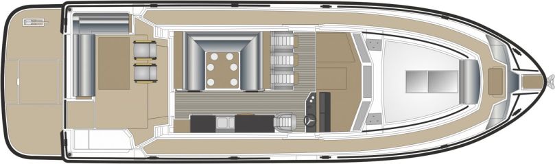 Uudessa 45:ssä on kaksi ulko-oleskelutilaa, peräkannen L-sohva ja keulakannen U-sohva. Ohjaushyttiin mahtuu vaivatta pitkä pentteri, kahdeksan hengen U-sohva sekä neljä erillisistuinta ohjaamoon. Kojelaudan kallistuskulma on Sargoista tuttuun tapaan säädettävissä hyvän ergonomian takaamiseksi.