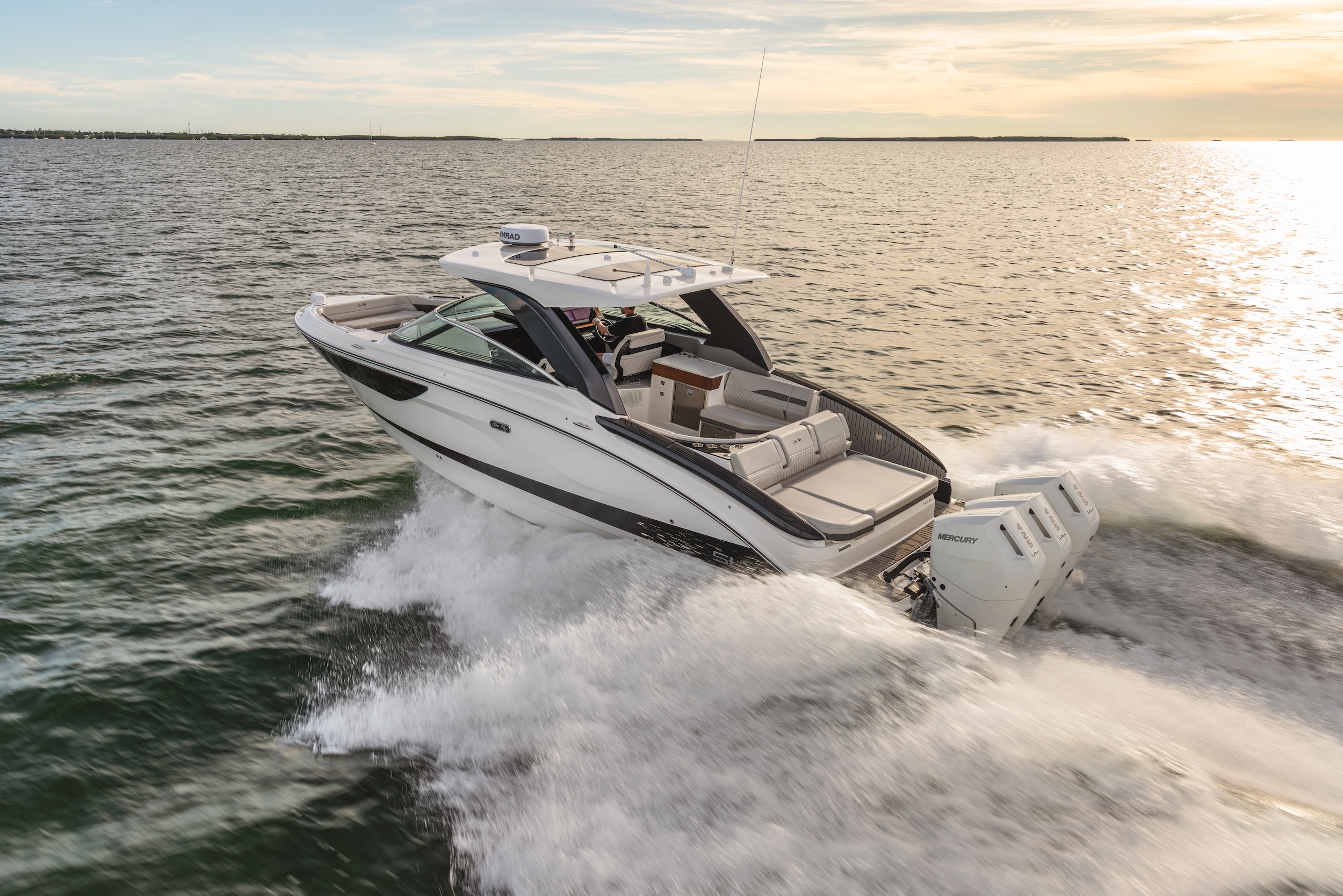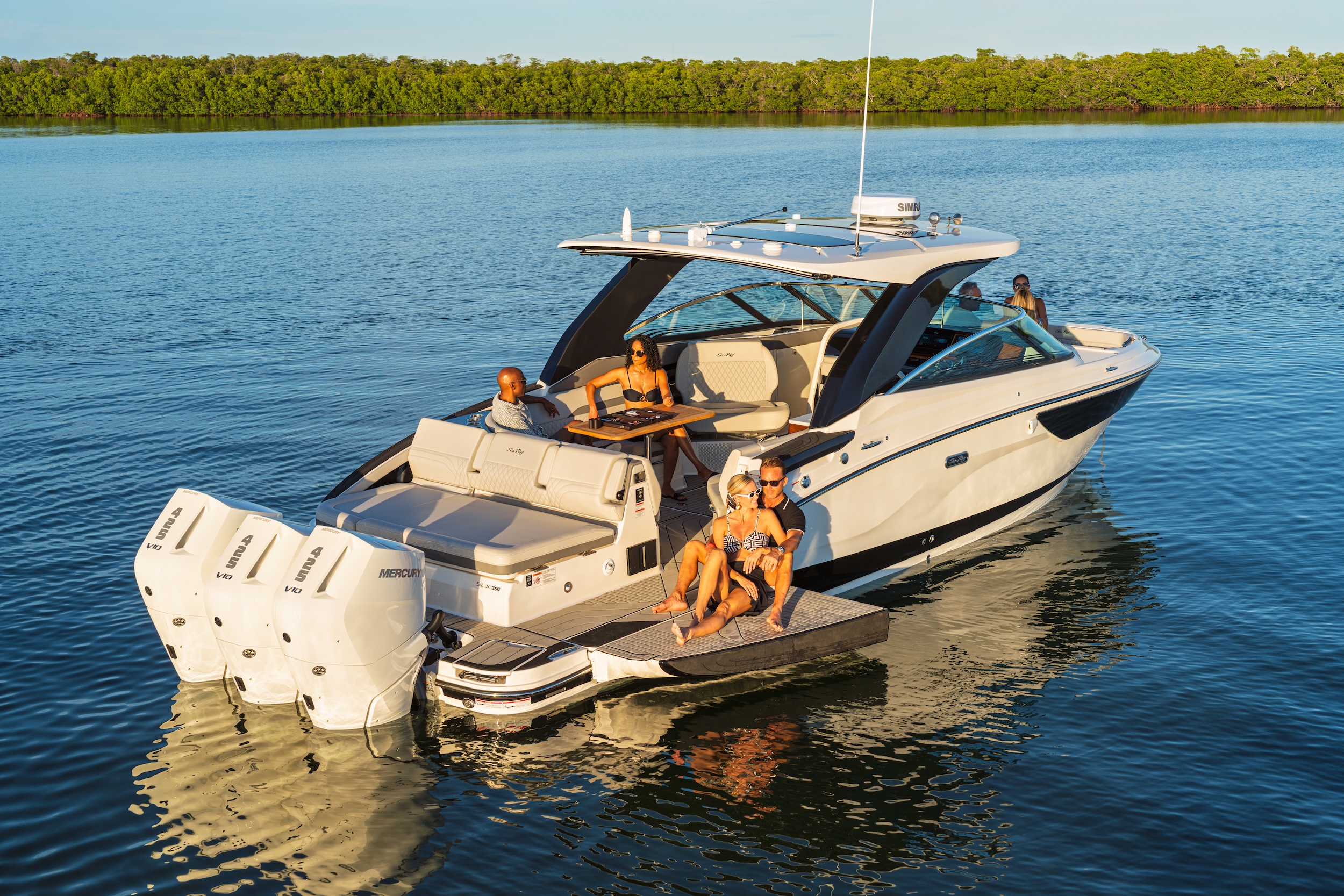SLX 360 varustetaan aina kolmella moottorilla. Vakiotriona soittaa 300-hevosvoimaiset V8:t, mutta jos alle tuhat hevosvoimaa ei riitä, voi päivittää yhteistehon 1 275 hevosvoimaan nostaviin 425-hevosvoimaisiin V10:hin. Järjen ääni on suurten perämoottoriveneiden konetehoissa kadonnut jo aikaa sitten. Vielä jokunen vuosi sitten 36-jalkaiseen sportcruiseriin riitti vallan mainiosti kaksi noin 250-hevosvoimaisia dieselsisäperää.