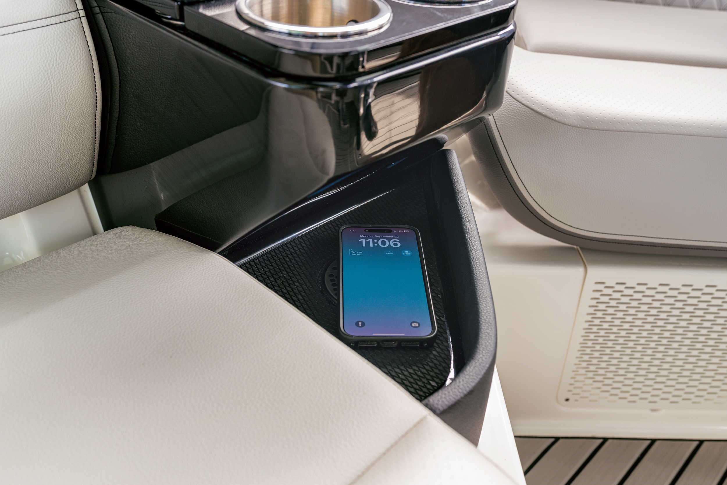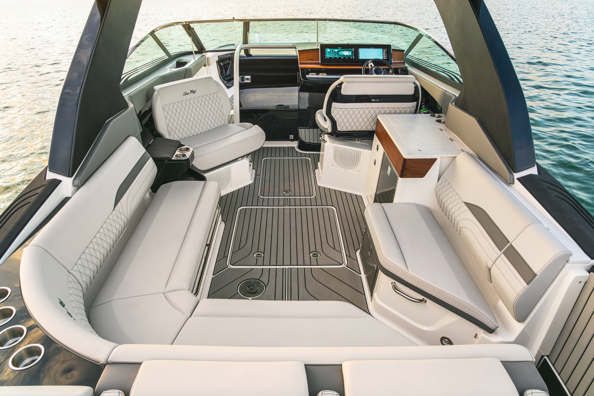 Teknologiaa on ladattu mukaan paljon. Kojelaudassa on kahden leveän 15-tuumaisen kosketusnäytön patteri ja venettä voi hallita perinteisten hallintalaitteiden sijaan tarkalla joystickilla. SLX 360:stä tulee myös ensimmäinen Sea Ray, johon saa lisävarusteena Simradin Active Captain -parkkeerausautomatiikan, muttei ihan vielä.