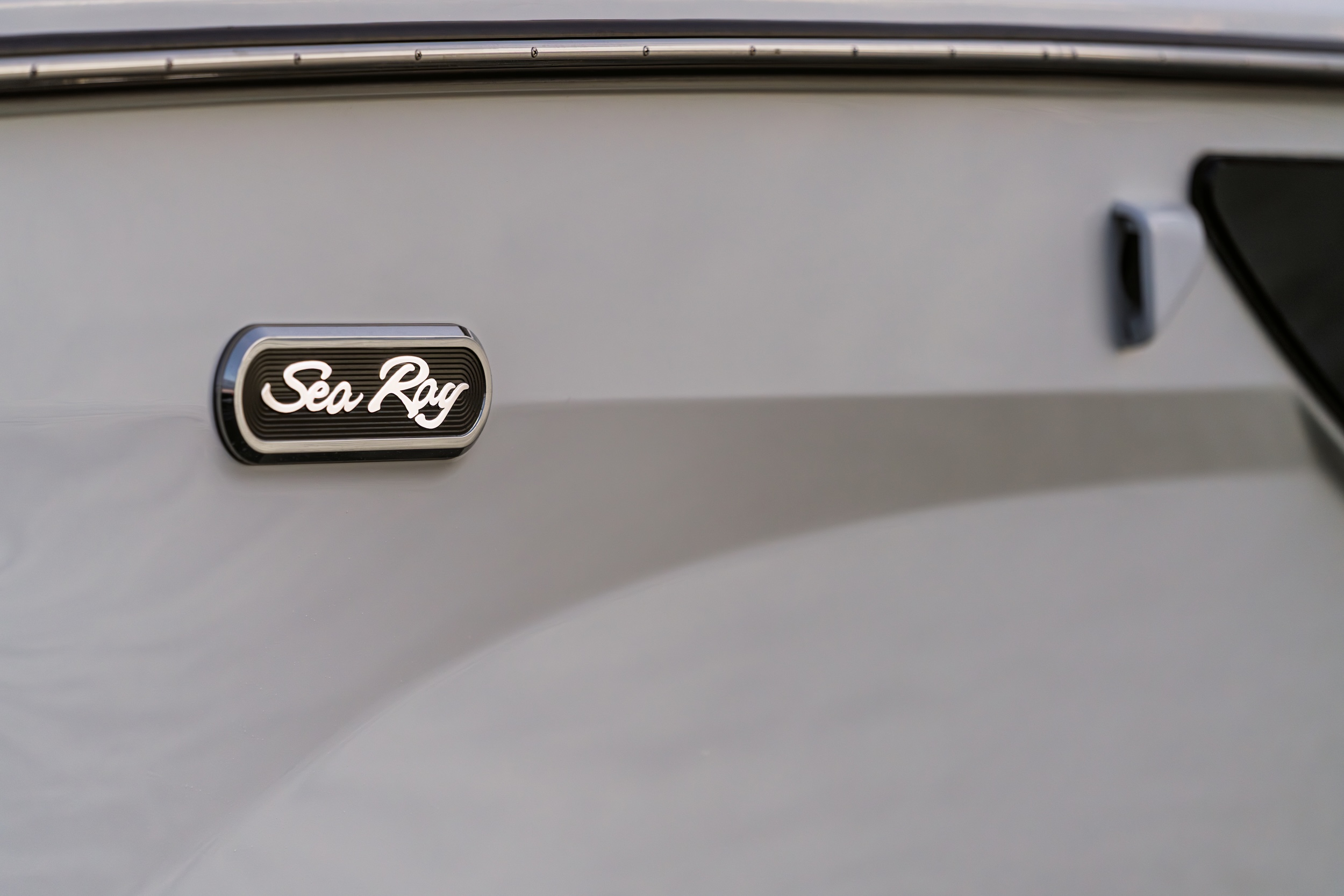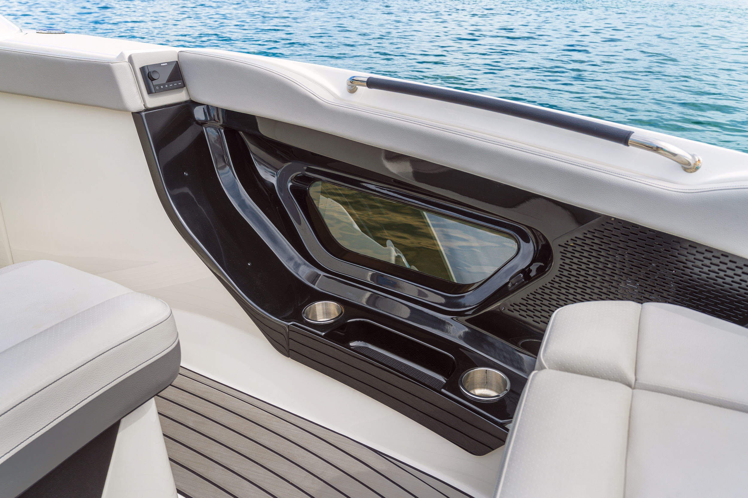 Styyrpuurin runkoikkuna avartaa ja tuo luonnonvaloa sekä toilettiin että pääkajuuttaan. Mutta SLX 360:ssä on sisätilojen lisäksi runkoikkunat myös etuavotilassa. Aikamoista. Blingblingiä tuo valopaketti, johon kuuluu muun muassa kylkien valaistut Sea Ray -logot, katosta avotilan lattiaan heijastettava Sea Ray -logo sekä kaikissa värisävyissä säädettävä koko veneen tunnelmaledivalaistus.