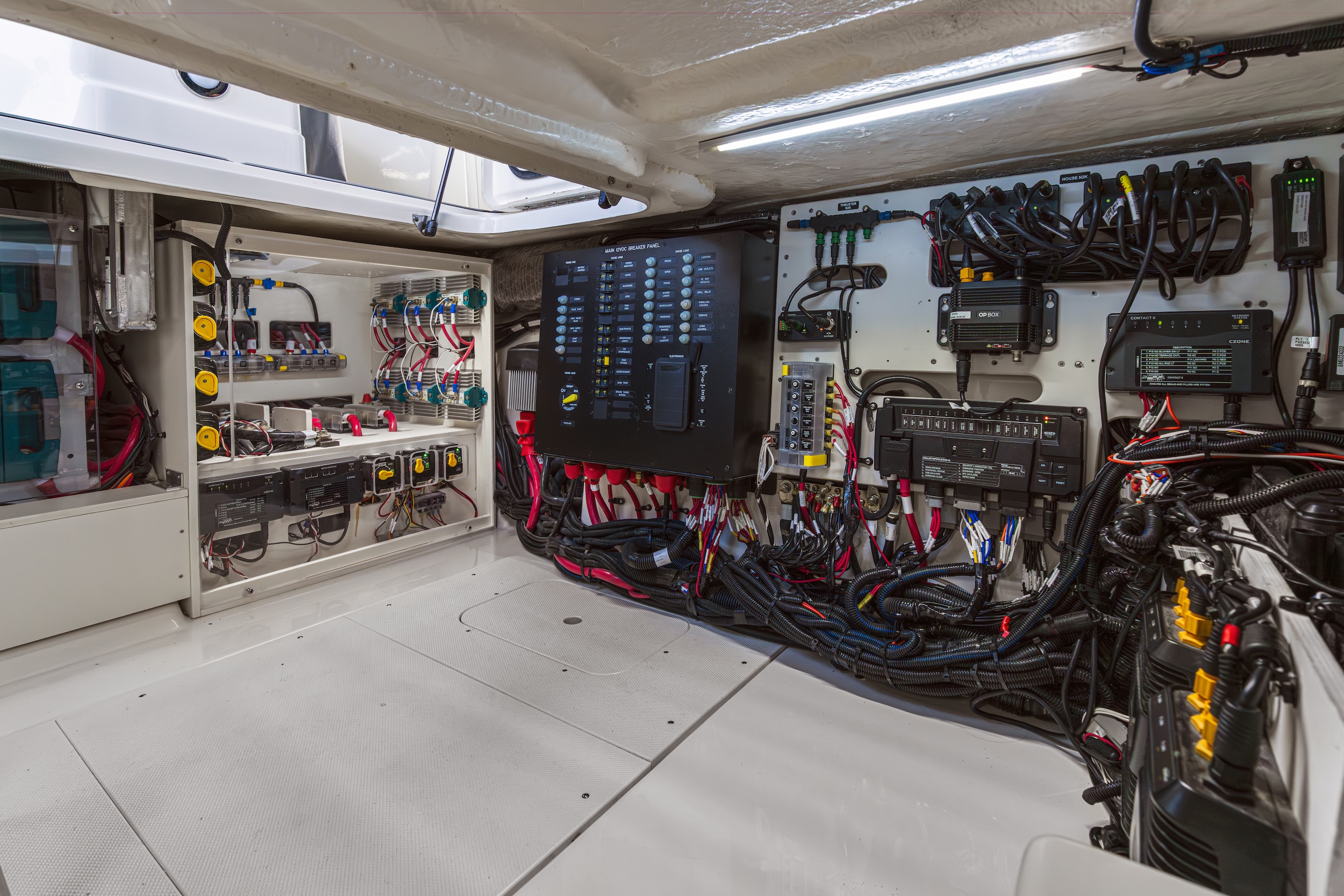 Vaikka perän ja keulan muhkeasti topatut oleskelutilat ovat varmasti mukavuudeltaan erinomaisia, voi asiaa upgreidata avoveneessäkin lämpötilaa säätelevällä ilmastoinnilla ja keikkumisen kitkevällä gyro-vakaimella. Sähkösyöpöt järjestelmät vaativat toimiakseen joko generaattorin tai litiumakkuihin pohjaavan Fathom e-Power -järjestelmän. Perämoottoriveneessä niille on kannen alla hyvin tilaa.