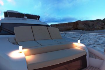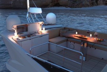 Kansisalongin sivuikkunat ylettyvät lattiasta kattoon. Pentteri on kansisalongin takareunassa, joten tarjoilu hoituu yhtä helposti sekä sisäsalonkiin että avotilaan. Uimatasolle ja yläkannelle saa poikkeuksellisen toimivilta kuvissa näyttävät ulkopentterit. Yläkannen pinta-alaksi kerrotaan peräti lähes 14 neliötä.