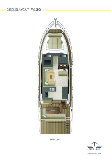 Sealine on onnistunut pakkaamaan 43-jalkaan paljon kaikkea. Veneessä on esimerkiksi neljä varsin houkuttelevan hyvännäköistä oleskelutilaa (keulakannella, peräkannella, yläohjaamossa ja kansisalongissa), kaksi suihkukomerolla varustettua toilettia ja tilaratkaisusta riippuen joko kaksi tai kolme makuukajuuttaa.
