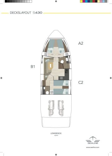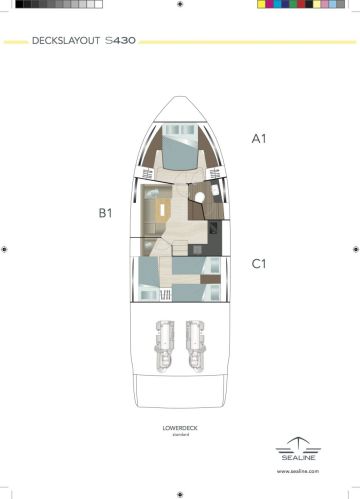 S430:ssa on pitkä uimataso ja se äärellä avotilassa kaksiosainen sohva, jonka paapuurin puoli on kiinteästi paikallaan. Styyrpuurin puoliskon saa liuútettua erilleen. Sohvan asennosta riippuen kulkuväylä uimatasolta peremmälle veneeseen muodostuu siis joko keskelle tai styyrpuurin laidalle. Sohvasta saa muodostettua myös kookkaan, yhtenäisen aurinkotason.