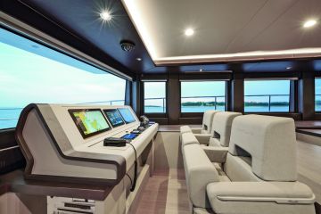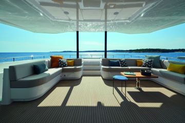 Ensimmäisessä, huhtikuussa veteen lasketussa Silent 62 3-Deck Openissa – eli yläkanneltaan avoimessa mallissa – on käytetty materiaaleja ja sävyjä, jotka luovat harmonisen ja arvokkaan kokonaisuuden. Kermanvalkoinen nahkaverhoilu, harmaat kangaspäällysteet sekä luonnonpuusta valmistetut kaapit ja lattiat täydentävät toisiaan yksinkertaisen tyylikkäästi.