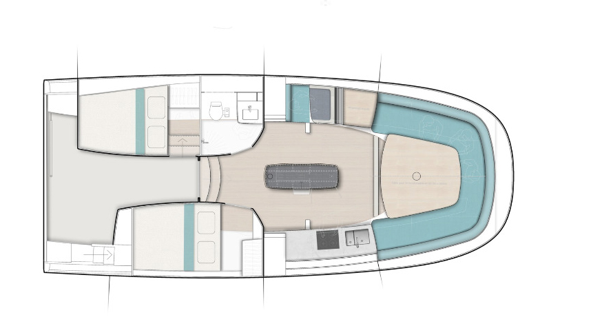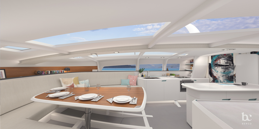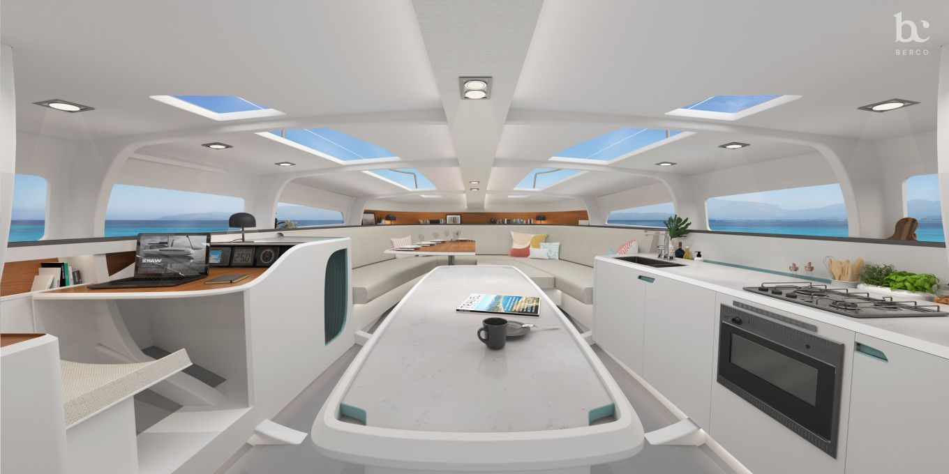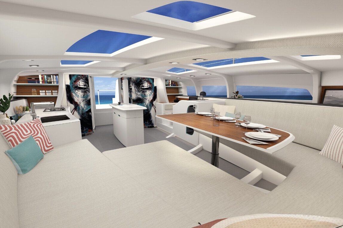 Portaikosta laskeutuvalle avautuu huiman avara, ilman väliseiniä keulaan asti ulottuva tila. Katon ja ruffin ikkunoista tulvii luonnonvaloa. Keulaa kiertää pitkä sohva, jonka keskellä on yksirunkoiseen veneeseen harvinaisen suuri pöytä. Tilan saa erotettua verhoilla makuualkoviksi. Keskellä tilaa lipastoryhmä kätkee taittokölin koneiston. Styyrpuurin laitaa vasten on pentteri ja vastalaidalla navigointipiste. Portaikon paapuurin puolella on suuri toiletti ja kaksi kahden hengen kajuuttaa työntyvät laidoilla osin avotilan alle.