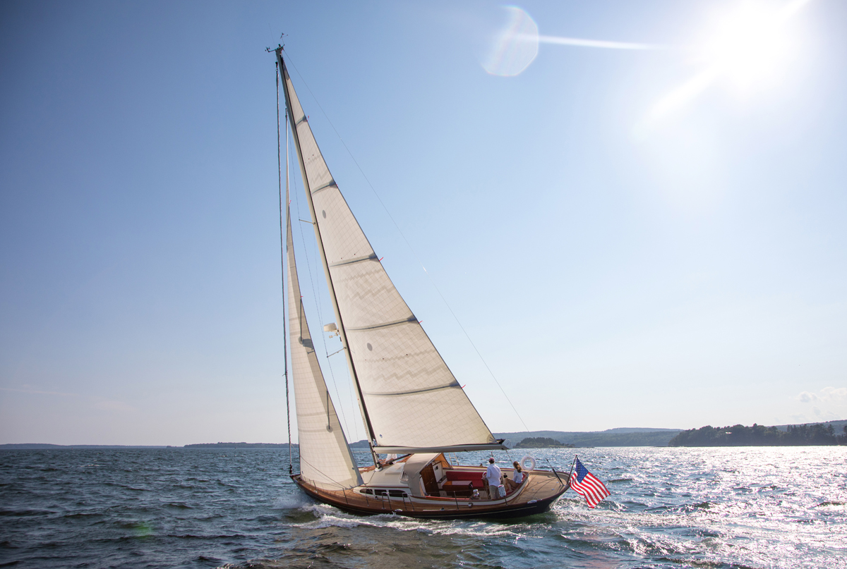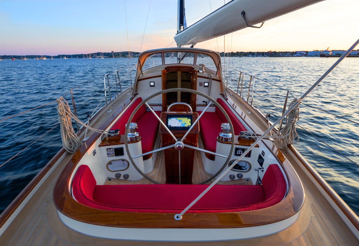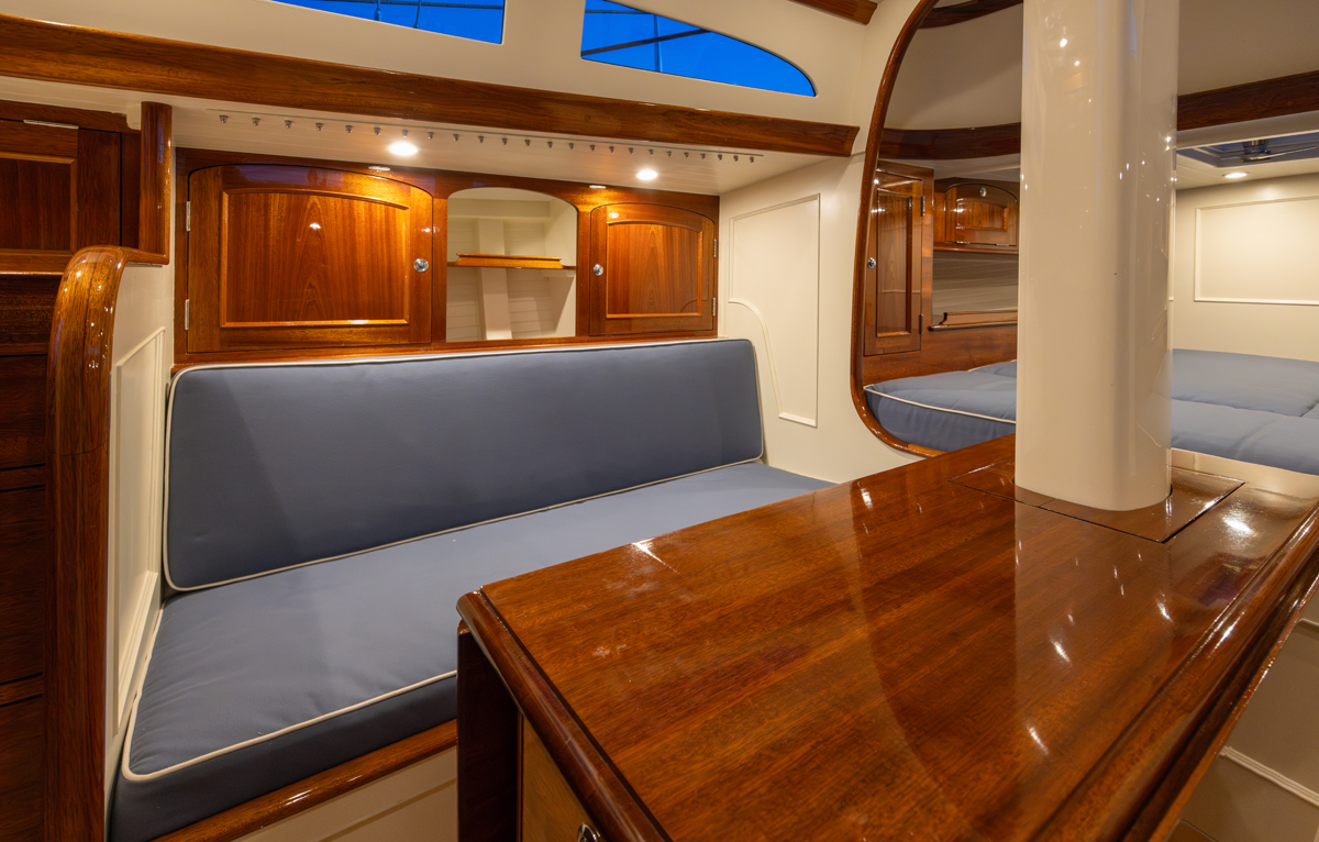 Rungon linjoihin, pintamateriaaleihin ja värien käyttöön on haettu inspiraatiota 1950-luvulta, kertoo suunnittelija Paul Waring. Kauempaakin, tekee mieli arvioida. Vaikkapa sisätilojen valkoiset laipiot ja katto sekä tyylikkäät listat tummaa mahonkia tuovat mieleen Nathaniel Herresshoffin voittoisat America's Cup -jahdit viime vuosisadan alusta.