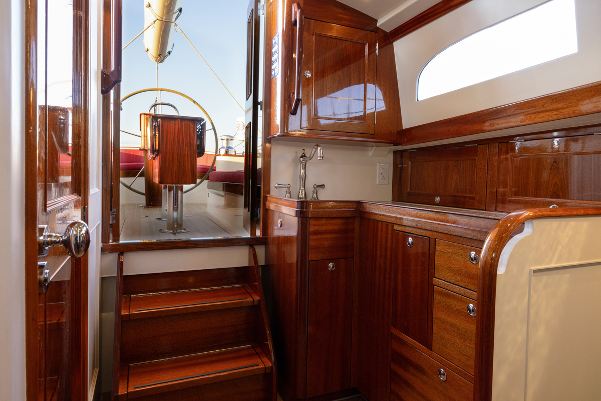 Rungon perinnelinjat näkyvät kauniisti kaartuvassa keulassa sekä komeasti vedestä nousevassa peräpeilissä. Pinnan alle jää voimakkaasti keskelle venettä sijoittuva uppouma, jonka ansiosta salonkiin on saatu täysi seisomakorkeus ilman ruffin liiallista korottamista. Sohvaryhmä on yksinkertainen, suorat kahdenistuttavat sohvat molemmilla laidoilla ja niiden välissä pöytä. Tiivis pentteri ja käsisuihkulla varustettu toiletti ovat portaikon molemmin puolin.