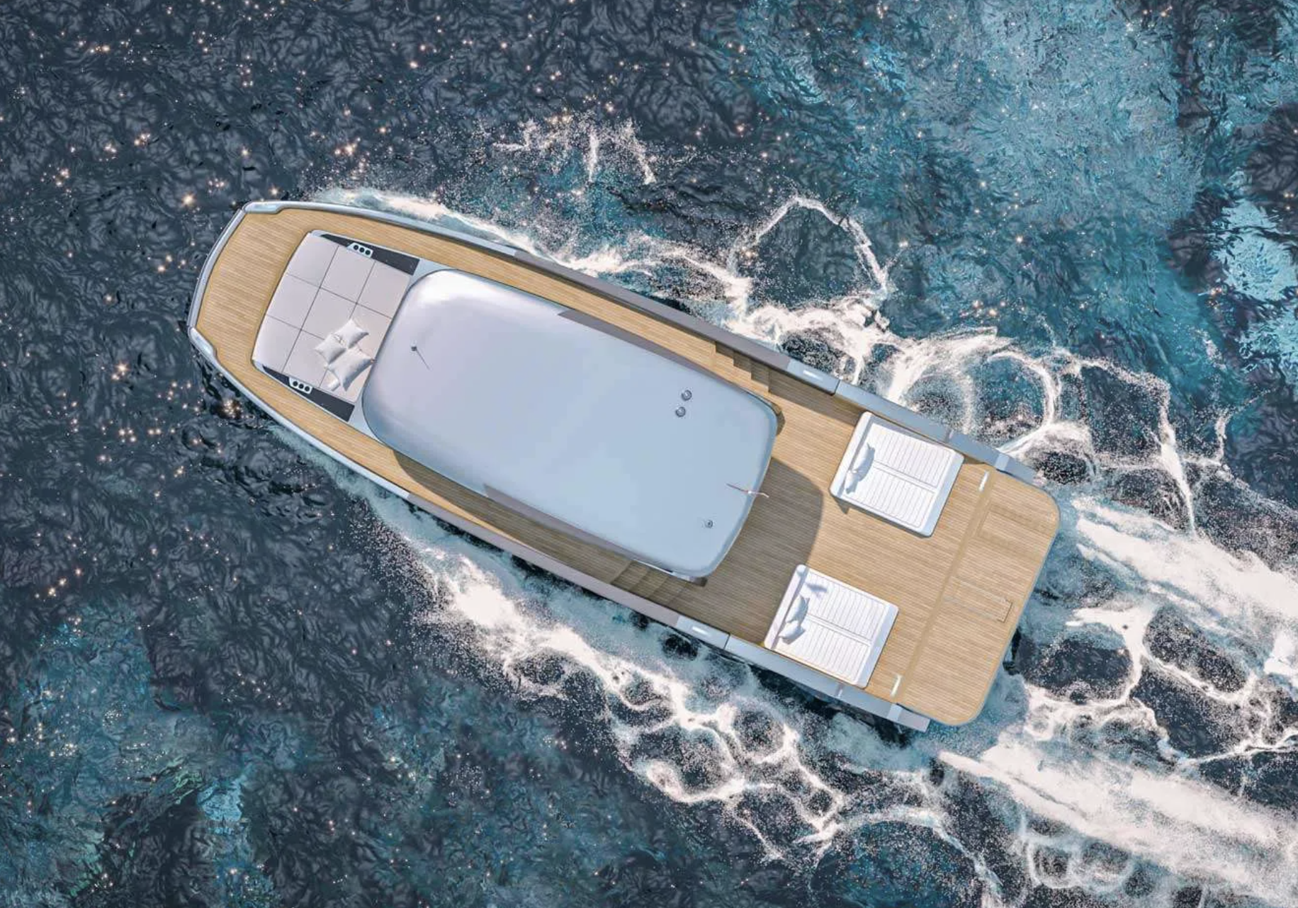 Takakansi, salonki ja ohjaamo on toteutettu yhdessä tasossa, joka edesauttaa sujuvaa kulkemista ja vähentää kiusallista kompurointia: drinkit pysyvät lasissa niin ajossa kuin ankkurissa ollessa. Keulakannelle, jossa on avara alue auringonpalvojia varten, noustaan sivukansien muutamaa askelmaa pitkin. Kaikki turkit on vuorattu tiikillä.