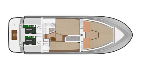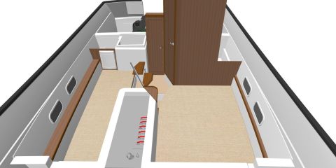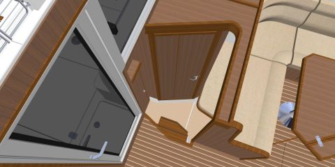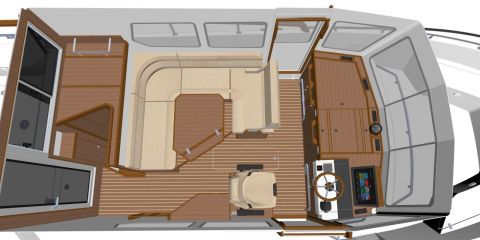 Sisällä tilat ovat kutakuinkin ennallaan. Takaovelle johtaa kulkuväylä, jonka varrella on takaseinän ja sohvaryhmän välissä parista porrasaskelmasta muodostuva kulku takakajuuttaan ja toilettiin. Keulaan voi valita vakiomallin syvän etuavotilan ja pienemmän kajuutan tai etuavotilan kustannuksella suuremman ja mukavamman Comfort Fore Cabin -keulakajuutan.