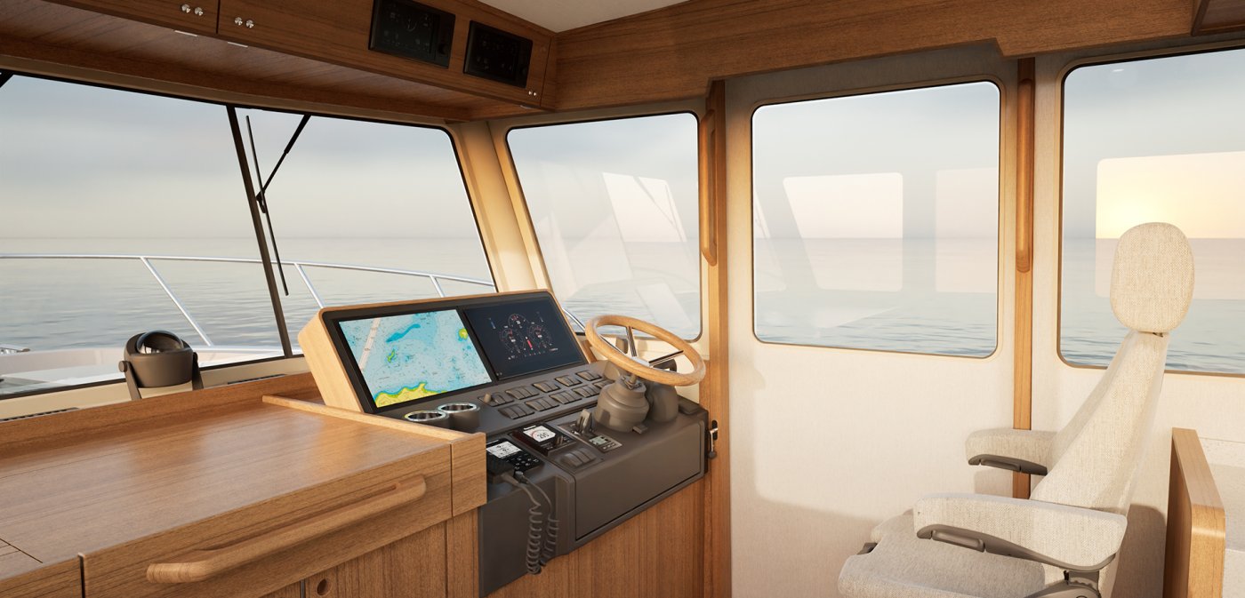 Ohjaamon ergonomia on tuttua Targaa eli odotusarvoltaan oikein mainio sekä seisten että istuen. Oleellinen tekijä on kojelaudan säädettävä keinupaneeli, johon ratti, kaukohallintalaite ja muutama muu päähallintalaite on kiinnitetty. Sivu- ja takaliukuovien ohella ohjaushyttiä saa avattuna komentosillan yltä kolmen erillisen kattoluukun verran.
