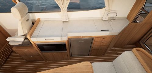 Takakannen vakiokalusteisiin kuuluu taittopöytä ja tutut laitaistuinlaatikot, joihin saa lisävarusteena muotoillut istuin- ja selkänojapehmusteet. Konehuoneen luukun alla on paikka parille kansituolille. Kolmas istuinlaatikko on ohjaushytin takaseinää vasten, ja sen voi varustaa kylmäkoneikolla.