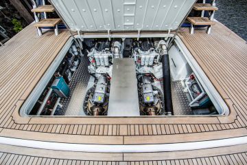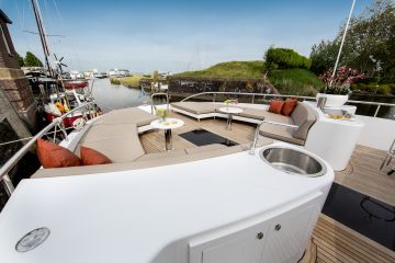 BeachClub-nimi tulee juuri kookkaasta uimatasosta ja sen yhteydessä olevasta takakajuutasta, jota ei ole sisustettu makuukammariksi vaan huikealta vaikuttavaksi salongiksi, josta on kookkaiden lasiovien kautta suora yhteys uimatasolle.