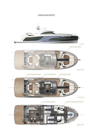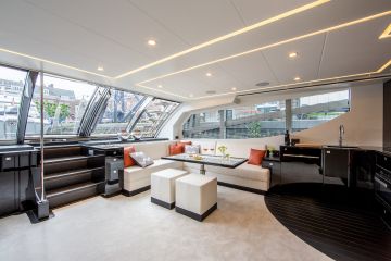 Oleskelutilat eivät jää siihen, sillä sekä takakannelta, ohjaushytistä ja keulakannelta löytyy mittavat sohvat ja loikoilumahdollisuudet. Majoitustilat sisältävät kolme makuukajuuttaa ja kaksi toilettia. Kookkaiden runko- ja kansi-ikkunoiden avartama omistajan sviitti on keulassa.