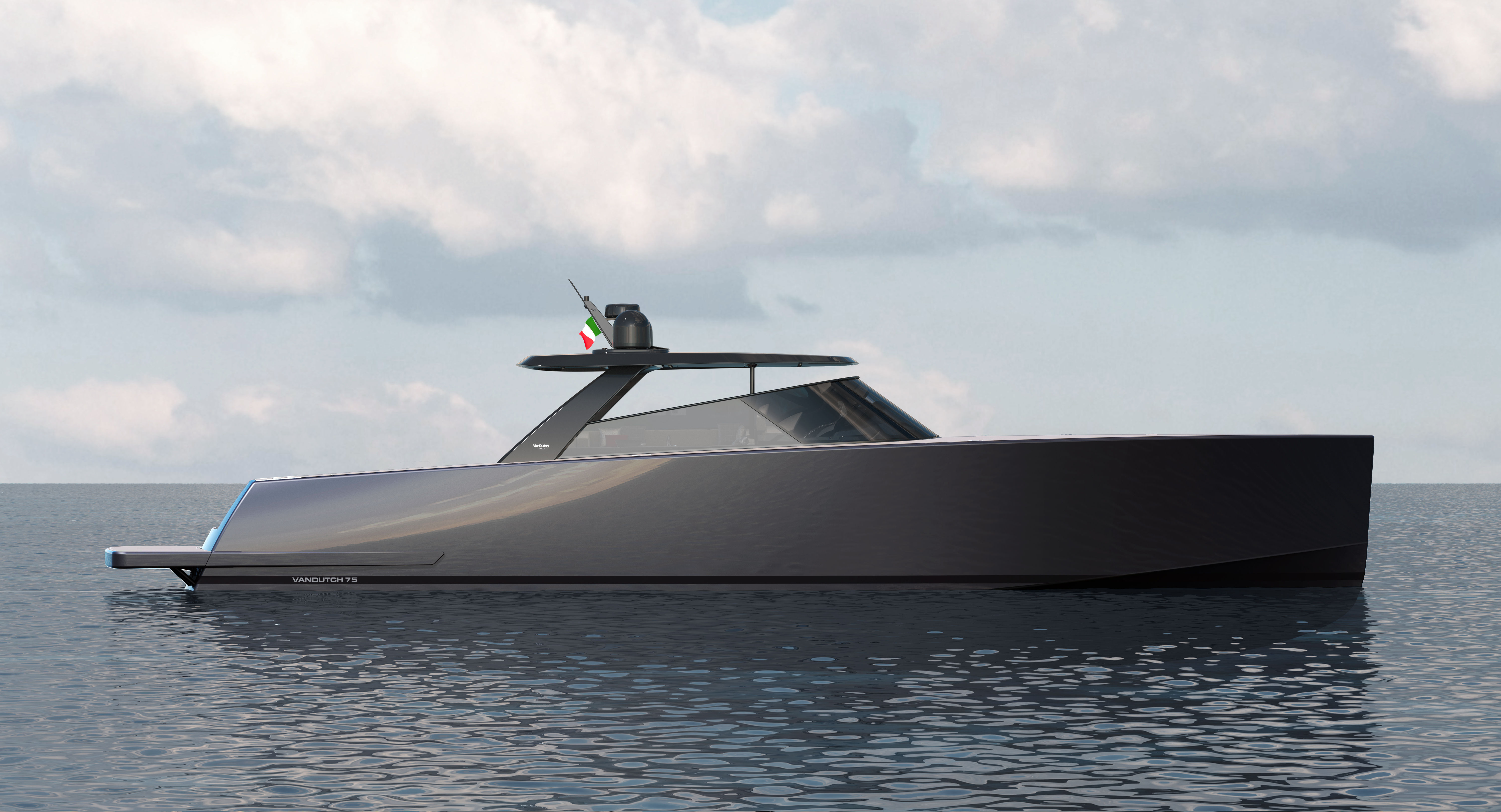 Cantiere del Pardo -konsernin alla operoiva Van Dutch julkaisi hiljattain renderikuvat uudesta lippulaivamallistaan. Hieman yli 22 metriä pitkä VanDutch 75 jatkaa merkin tunnistettavaa ilmettä: suhteellisen korkeat kyljet ja matala kansirakenne antavat veneelle pahaenteisen, jopa rikollisen olemuksen, jota täydentää harmaa pintakäsittely. VanDutch 75 sopisi ulkonäkönsä puolesta nykyaikaiselle salakuljettajalle kuin pirtukätkö saaristokirkon alle.