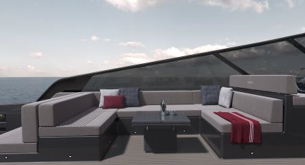 Ulkotilat on veistämön edellisiin malleihin verrattuna pistetty täysin uusiksi: hulppea 45-neliöinen avotila tarjoaa vastakkain sijoitetut sohvat muunneltavine pöytineen sekä mittatilaustyönä tehdyt urheilulliset, vintage-henkiset istuimet. Fenix-työtasolla varustettu ulkokeittiö sisältää grillin, lieden, jääkaapin ja jääpalakoneen.